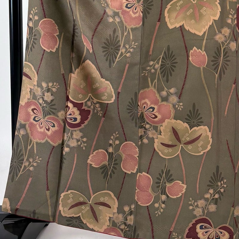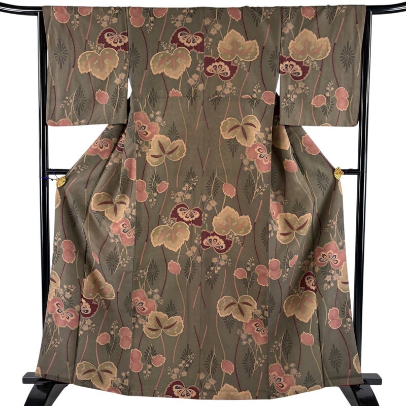 【着物ランク】優品 【素材】化繊 【身丈】約164cm 【裄丈】約65cm 【袖丈】約49.5cm 【袖幅】約33cm 【前幅】約24.5cm 【後幅】約29.5cm 【サイズ】M 【着物仕立て】袷 【着用時期】10~5月 【状態ランク】ランクB 【着物着用シーン】気軽なパーティー、観劇、食事会、正月、気軽なお茶会、街着