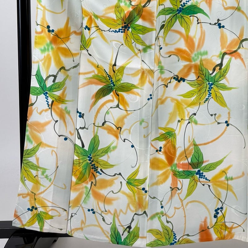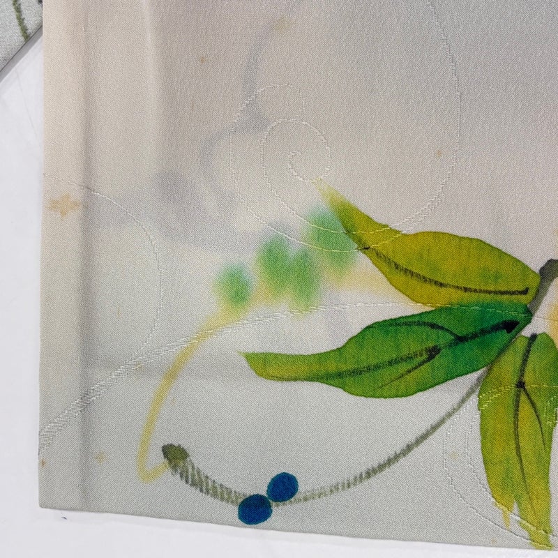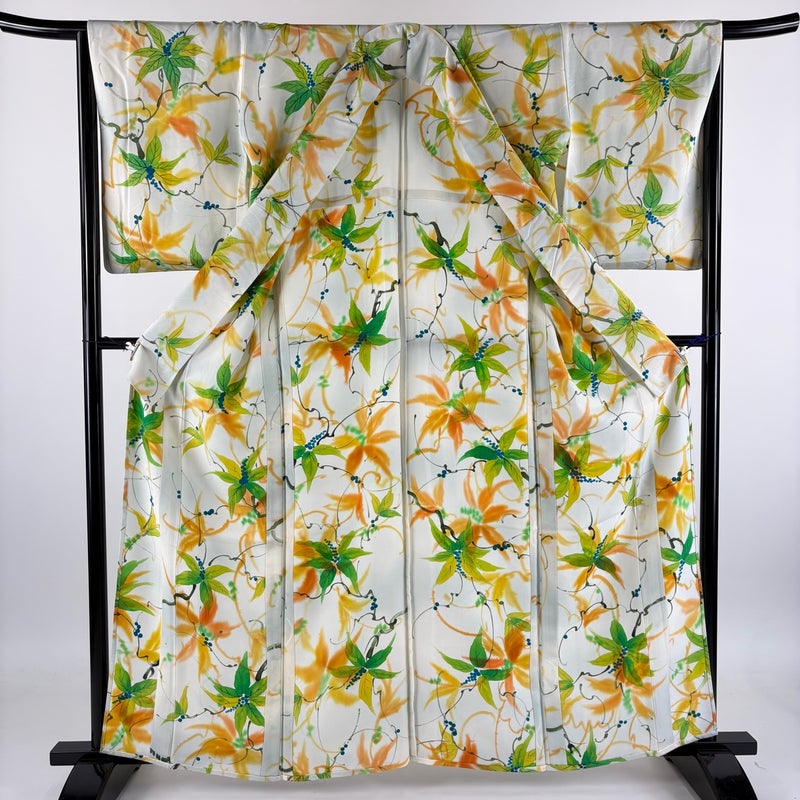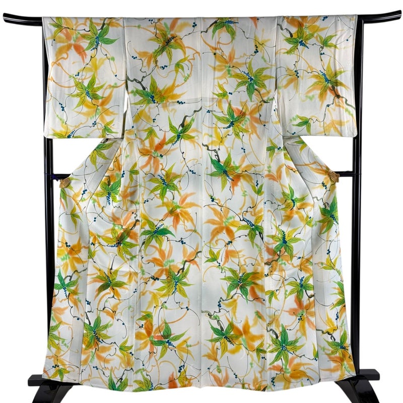 【着物ランク】優品 【素材】正絹 【身丈】約160.5cm 【裄丈】約65cm 【袖丈】約52.5cm 【袖幅】約33.5cm 【前幅】約24.5cm 【後幅】約30cm 【サイズ】M 【着物仕立て】単衣 【着用時期】6/9月 【状態ランク】ランクB 【着物着用シーン】気軽なパーティー、観劇、食事会、正月、気軽なお茶会、街着