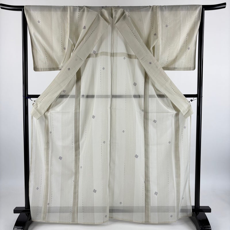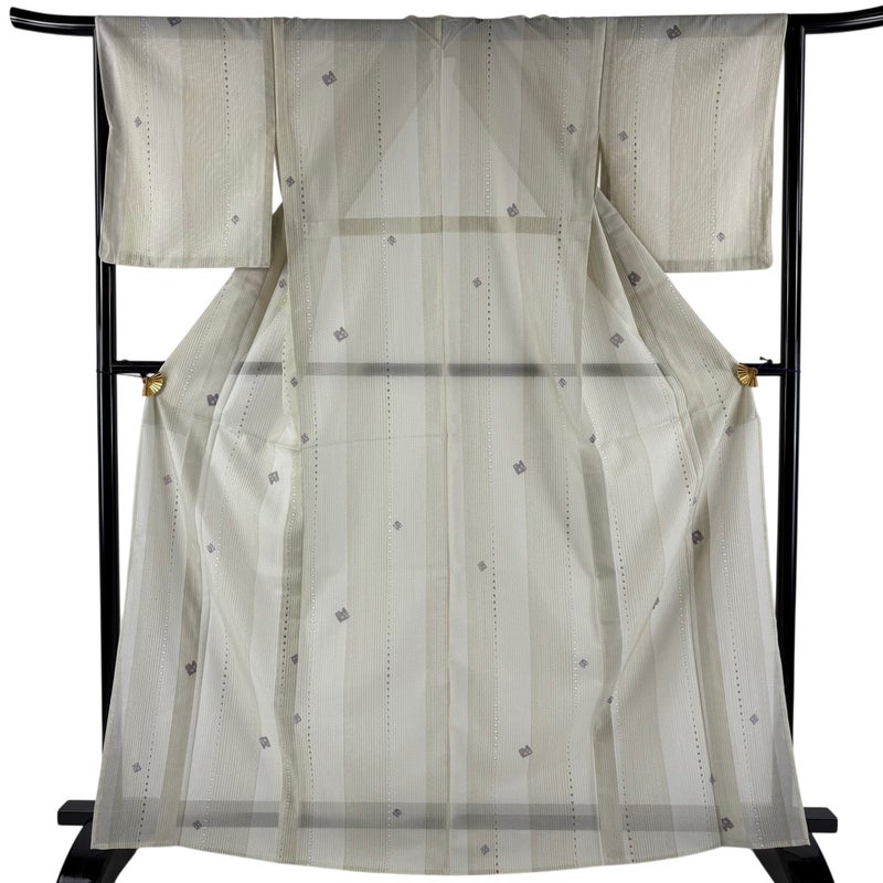 【着物ランク】優品 【素材】化繊 【身丈】約167cm 【裄丈】約65.5cm 【袖丈】約49.5cm 【袖幅】約33.5cm 【前幅】約24cm 【後幅】約30cm 【サイズ】M 【着物仕立て】薄物 【着用時期】7~8月 【状態ランク】ランクA 【着物着用シーン】気軽なパーティー、観劇、食事会、正月、気軽なお茶会、街着