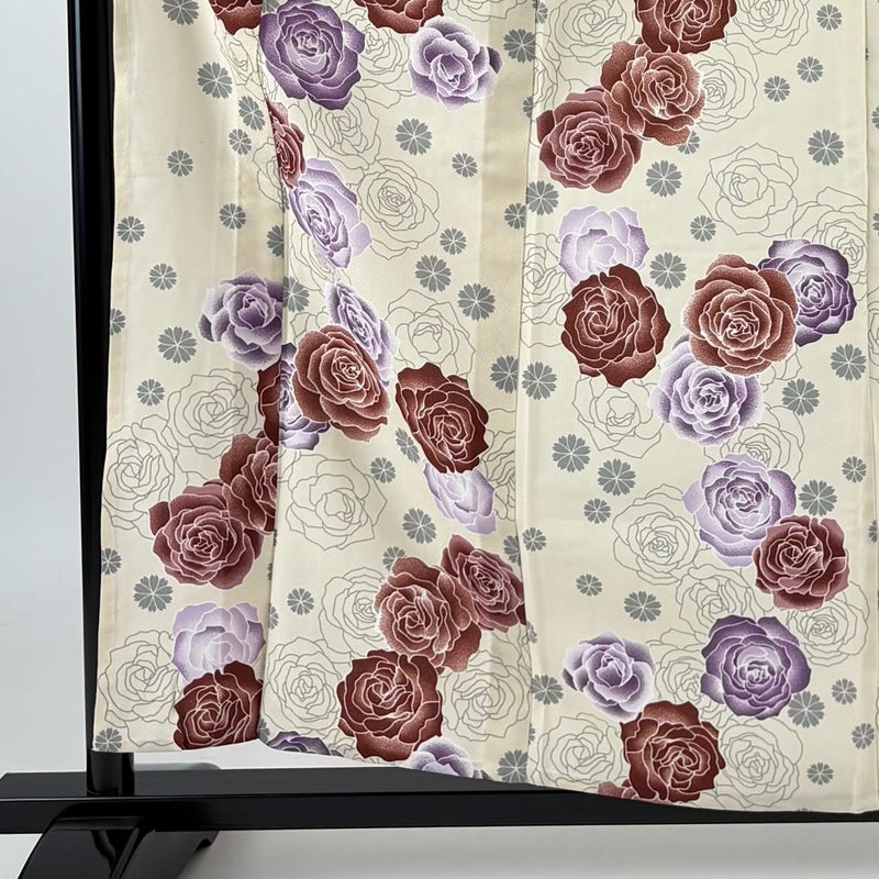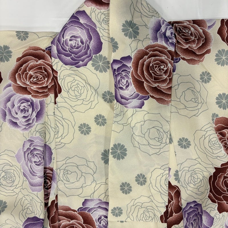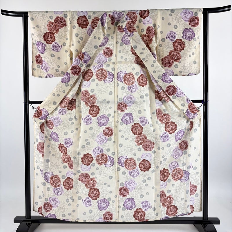 【着物ランク】優品 【素材】化繊 【身丈】約158.5cm 【裄丈】約63cm 【袖丈】約49.5cm 【袖幅】約31.5cm 【前幅】約23cm 【後幅】約30cm 【サイズ】S 【着物仕立て】単衣 【着用時期】6/9月 【状態ランク】ランクA 【着物着用シーン】気軽なパーティー、観劇、食事会、正月、気軽なお茶会、街着