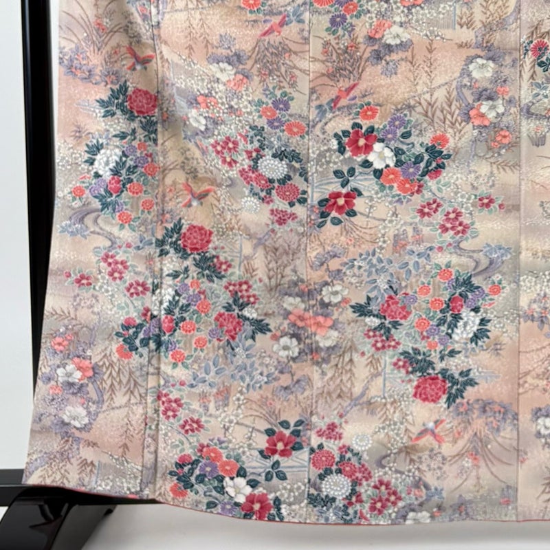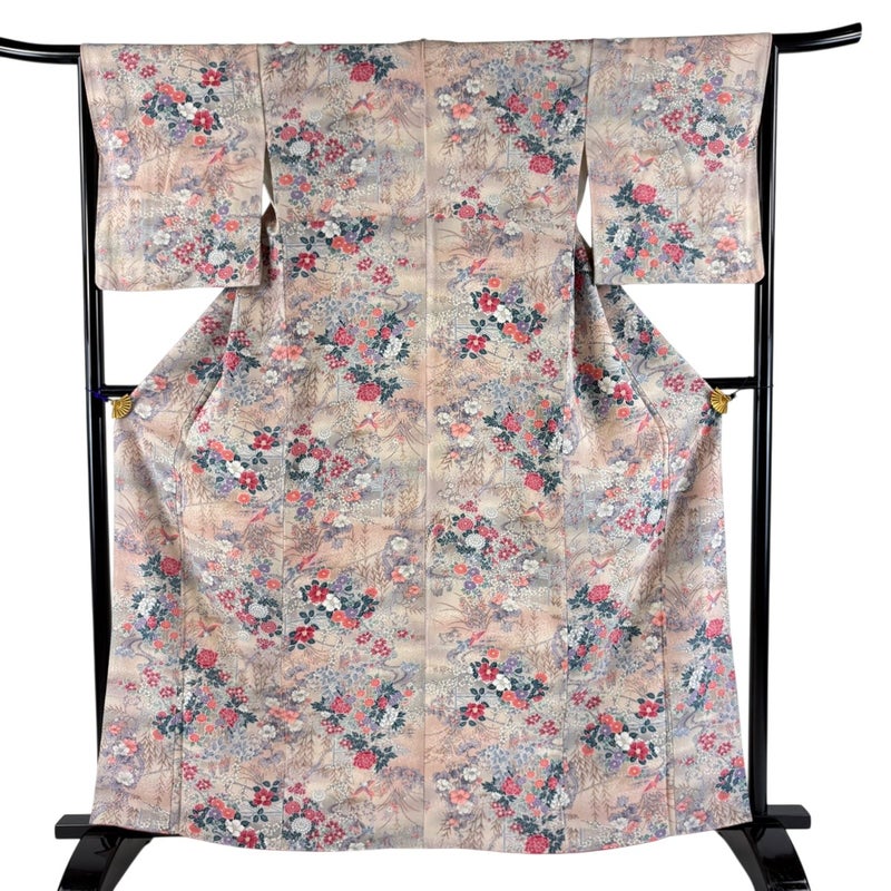 【着物ランク】優品 【素材】正絹 【身丈】約161cm 【裄丈】約67cm 【袖丈】約48.5cm 【袖幅】約33.5cm 【前幅】約22.5cm 【後幅】約28.5cm 【サイズ】M 【着物仕立て】袷 【着用時期】10~5月 【状態ランク】ランクA 【着物着用シーン】気軽なパーティー、観劇、食事会、正月、気軽なお茶会、街着