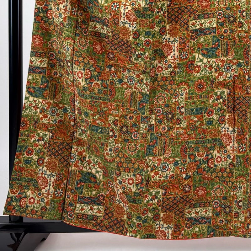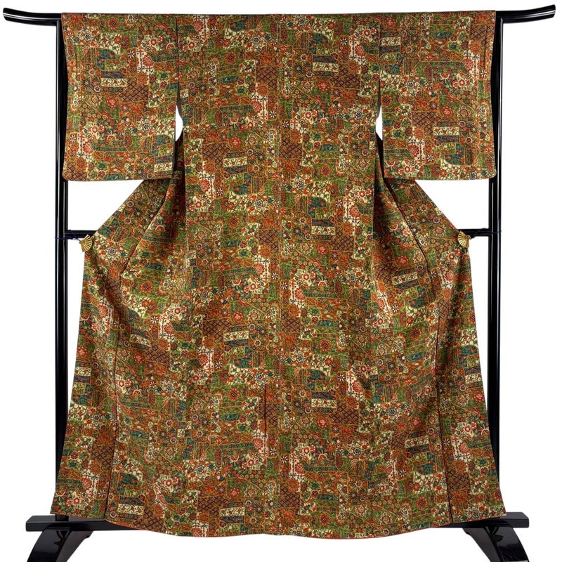【着物ランク】優品 【素材】正絹 【身丈】約160.5cm 【裄丈】約66cm 【袖丈】約52.5cm 【袖幅】約34cm 【前幅】約24cm 【後幅】約29.5cm 【サイズ】M 【着物仕立て】袷 【着用時期】10~5月 【状態ランク】ランクA 【着物着用シーン】気軽なパーティー、観劇、食事会、正月、気軽なお茶会、街着