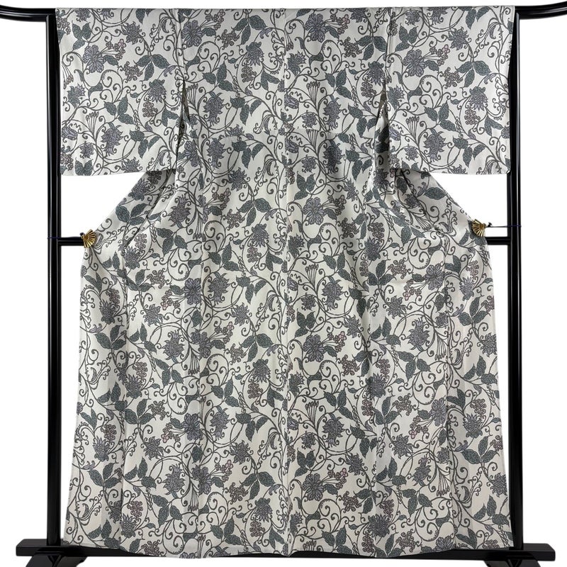 【着物ランク】秀品 【素材】正絹 【身丈】約159cm 【裄丈】約65cm 【袖丈】約50cm 【袖幅】約34.5cm 【前幅】約23cm 【後幅】約27.5cm 【サイズ】M 【着物仕立て】単衣 【着用時期】6/9月 【状態ランク】ランクA 【着物着用シーン】気軽なパーティー、観劇、食事会、正月、気軽なお茶会、街着