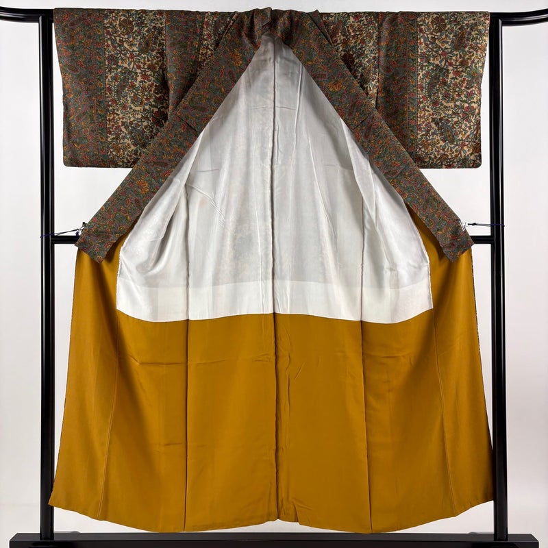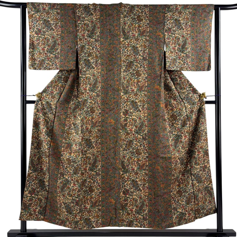 【着物ランク】秀品 【素材】正絹 【身丈】約151.5cm 【裄丈】約64.5cm 【袖丈】約46.5cm 【袖幅】約32.5cm 【前幅】約23cm 【後幅】約28cm 【サイズ】M 【着物仕立て】袷 【着用時期】10~5月 【状態ランク】ランクA 【着物着用シーン】気軽なパーティー、観劇、食事会、正月、気軽なお茶会、街着