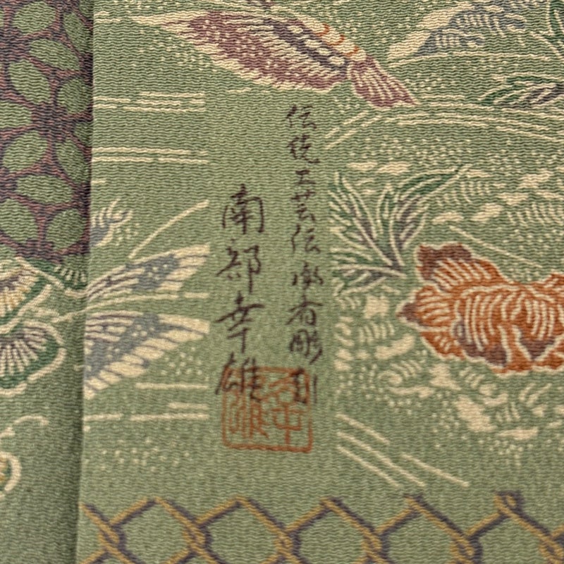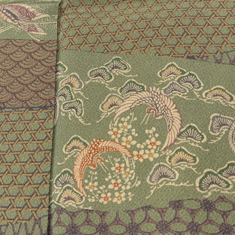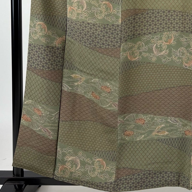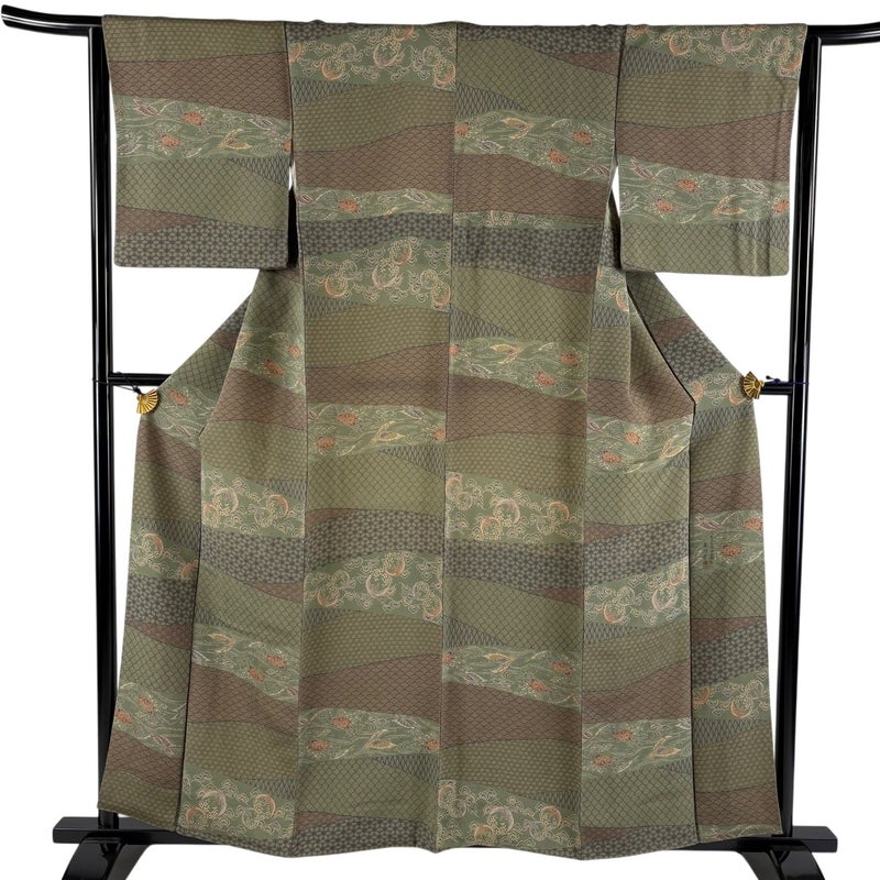【着物ランク】秀品 【素材】正絹 【身丈】約158cm 【裄丈】約64.5cm 【袖丈】約47.5cm 【袖幅】約32.5cm 【前幅】約23.5cm 【後幅】約29cm 【サイズ】M 【着物仕立て】袷 【着用時期】10~5月 【状態ランク】ランクA 【着物着用シーン】気軽なパーティー、観劇、食事会、正月、気軽なお茶会、街着