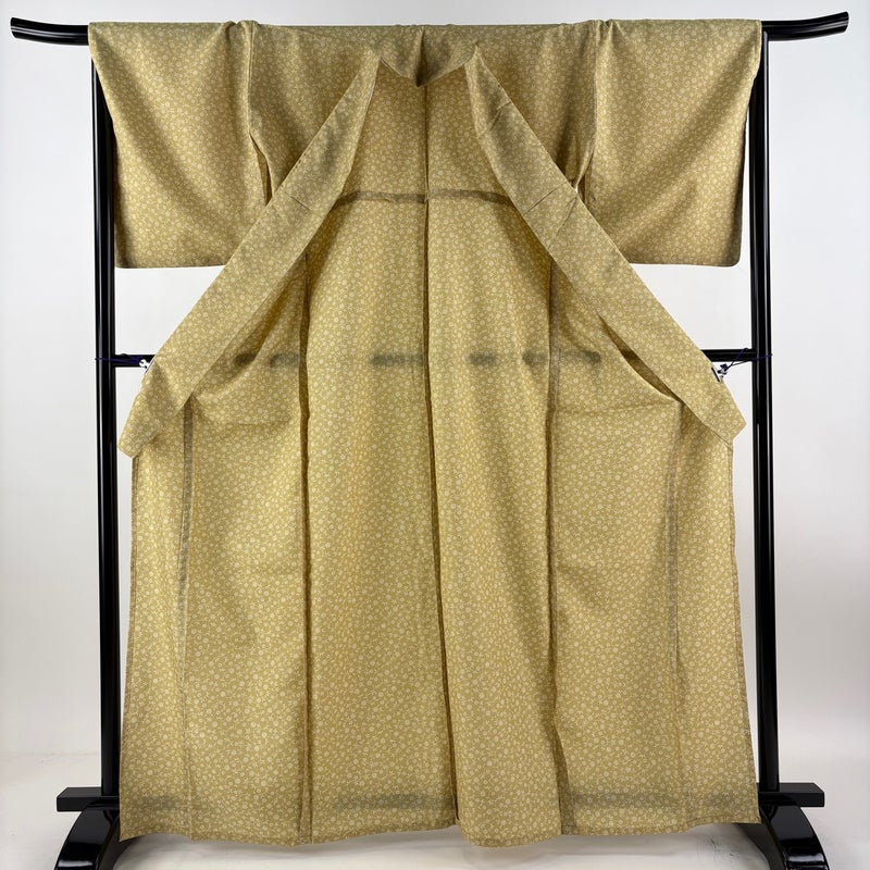 【着物ランク】優品 【素材】化繊 【身丈】約166cm 【裄丈】約67.5cm 【袖丈】約49cm 【袖幅】約34cm 【前幅】約25cm 【後幅】約29cm 【サイズ】L 【着物仕立て】単衣 【着用時期】6/9月 【状態ランク】ランクB 【着物着用シーン】気軽なパーティー、観劇、食事会、正月、気軽なお茶会、街着