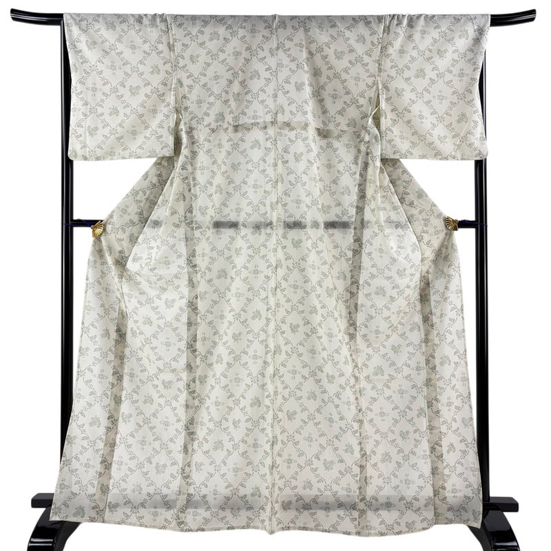 【着物ランク】優品 【素材】化繊 【身丈】約166cm 【裄丈】約68cm 【袖丈】約49cm 【袖幅】約34cm 【前幅】約25cm 【後幅】約30cm 【サイズ】L 【着物仕立て】薄物 【着用時期】7~8月 【状態ランク】ランクA 【着物着用シーン】気軽なパーティー、観劇、食事会、正月、気軽なお茶会、街着