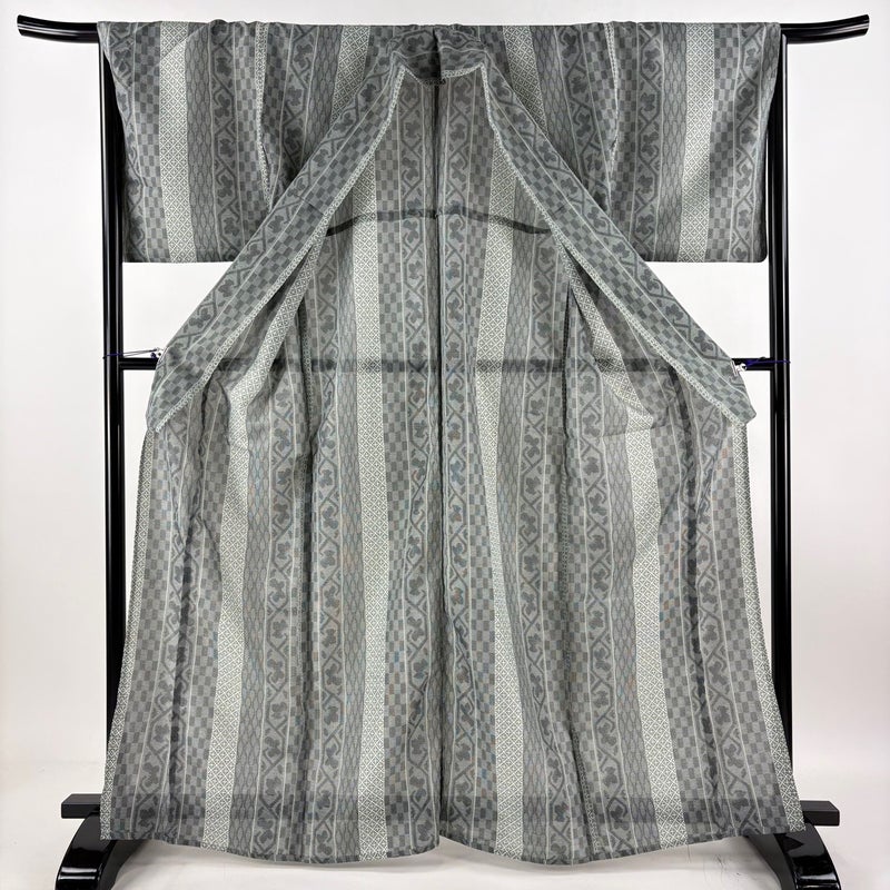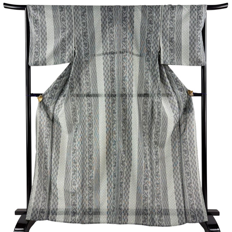【着物ランク】優品 【素材】化繊 【身丈】約165cm 【裄丈】約66.5cm 【袖丈】約48cm 【袖幅】約34cm 【前幅】約26cm 【後幅】約31cm 【サイズ】M 【着物仕立て】薄物 【着用時期】7~8月 【状態ランク】ランクB 【着物着用シーン】気軽なパーティー、観劇、食事会、正月、気軽なお茶会、街着