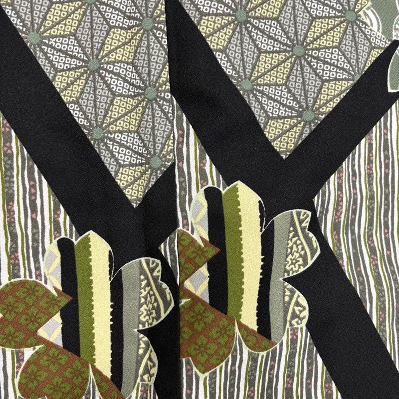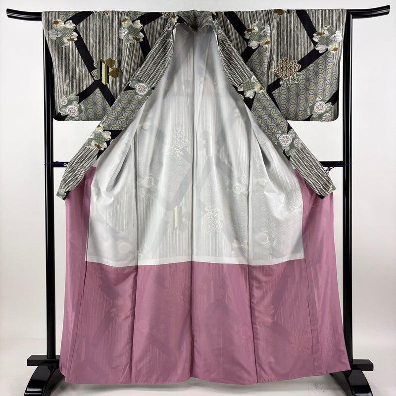 【着物ランク】優品 【素材】化繊 【身丈】約164cm 【裄丈】約66cm 【袖丈】約49cm 【袖幅】約33cm 【前幅】約25cm 【後幅】約30cm 【サイズ】M 【着物仕立て】袷 【着用時期】10~5月 【状態ランク】ランクB 【着物着用シーン】気軽なパーティー、観劇、食事会、正月、気軽なお茶会、街着
