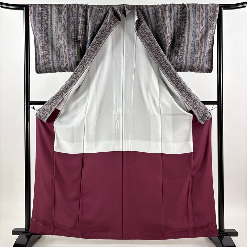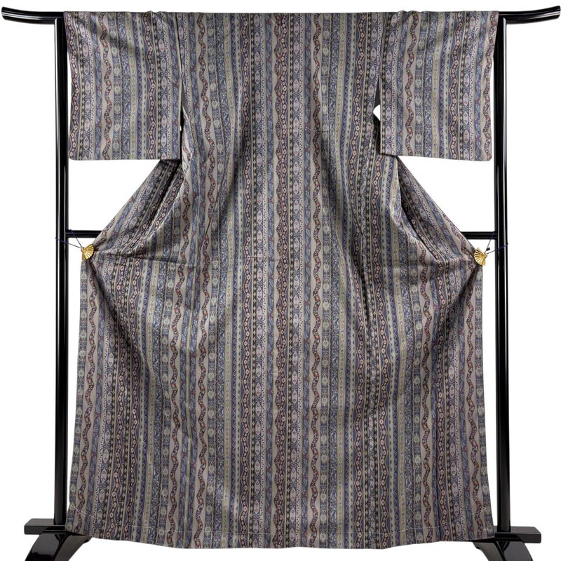 【着物ランク】優品 【素材】正絹 【身丈】約164.5cm 【裄丈】約63.5cm 【袖丈】約47cm 【袖幅】約33cm 【前幅】約21cm 【後幅】約27cm 【サイズ】S 【着物仕立て】袷 【着用時期】10~5月 【状態ランク】ランクA 【着物着用シーン】気軽なパーティー、観劇、食事会、正月、気軽なお茶会、街着