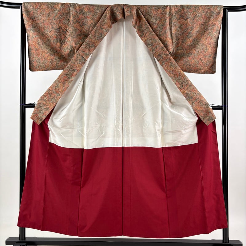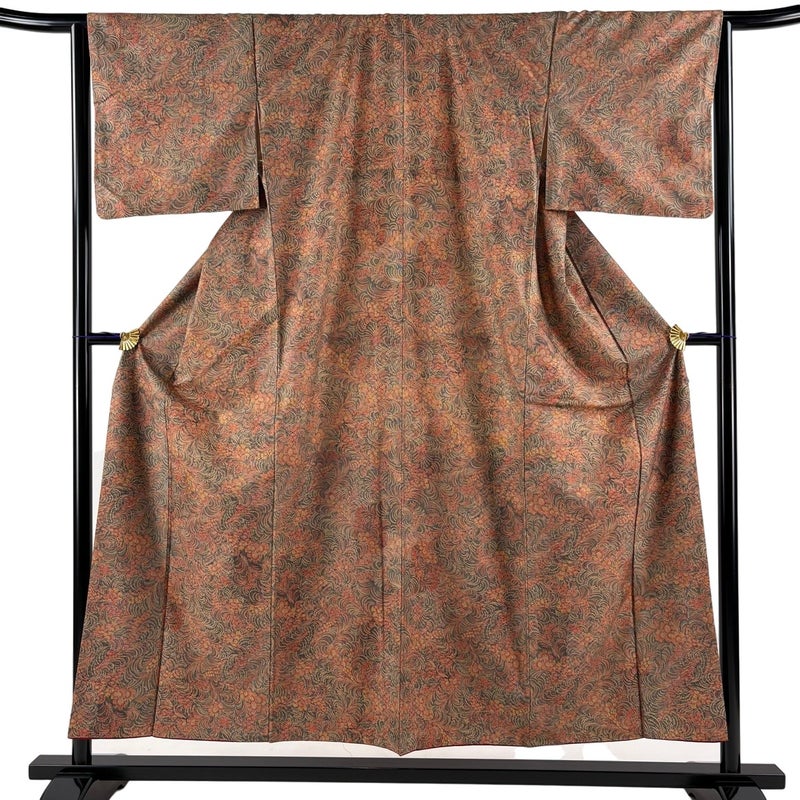 【着物ランク】優品 【素材】正絹 【身丈】約153cm 【裄丈】約64.5cm 【袖丈】約45.5cm 【袖幅】約33cm 【前幅】約24cm 【後幅】約29.5cm 【サイズ】M 【着物仕立て】袷 【着用時期】10~5月 【状態ランク】ランクA 【着物着用シーン】気軽なパーティー、観劇、食事会、正月、気軽なお茶会、街着