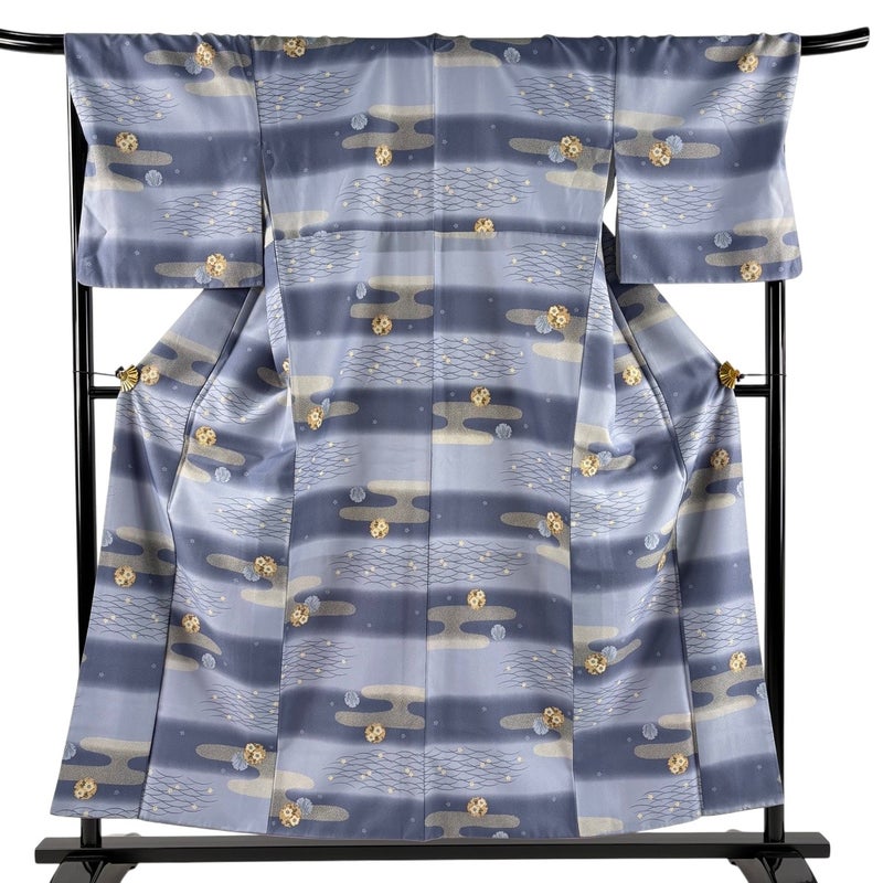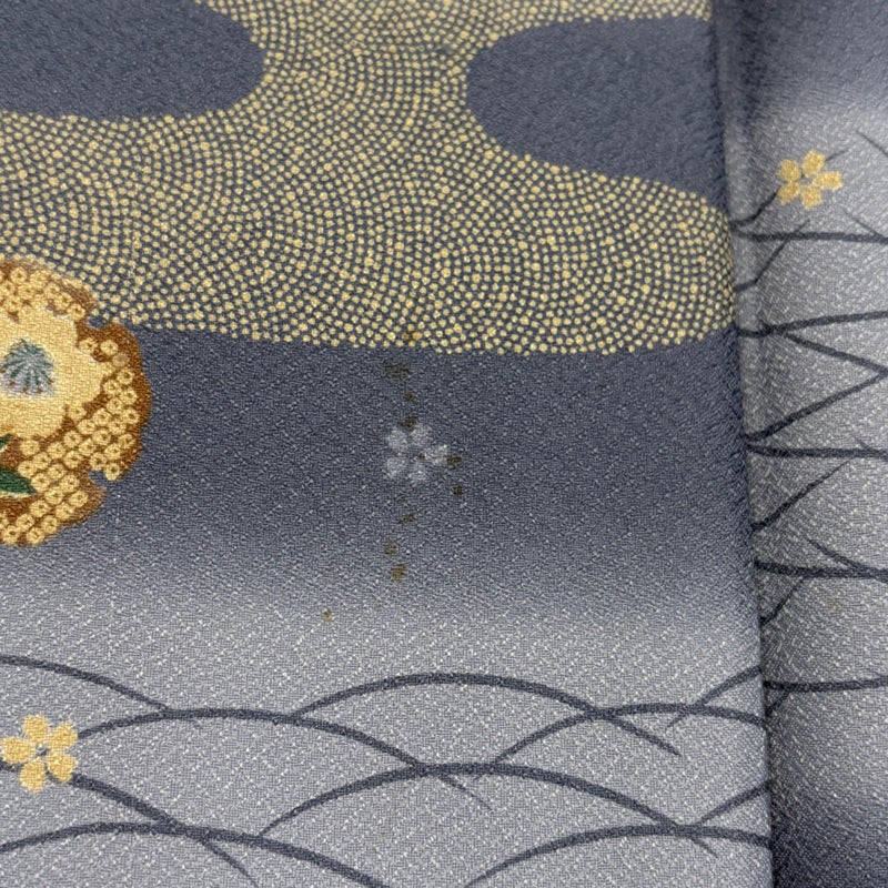 【着物ランク】優品 【素材】化繊 【身丈】約155.5cm 【裄丈】約70cm 【袖丈】約49.5cm 【袖幅】約35cm 【前幅】約24cm 【後幅】約30cm 【サイズ】L 【着物仕立て】袷 【着用時期】10~5月 【状態ランク】ランクB 【着物着用シーン】気軽なパーティー、観劇、食事会、正月、気軽なお茶会、街着