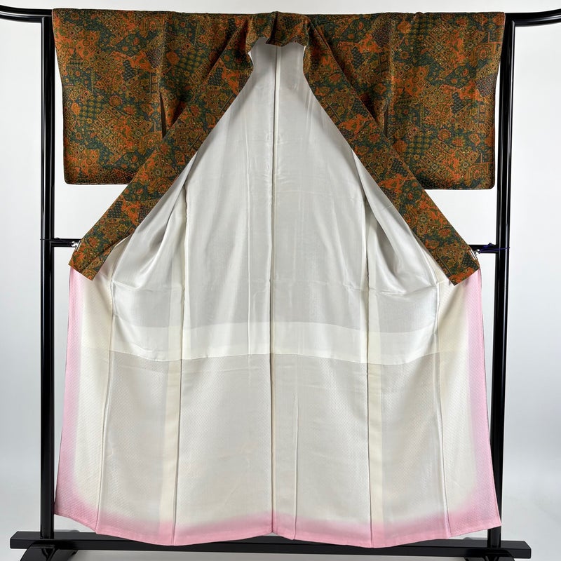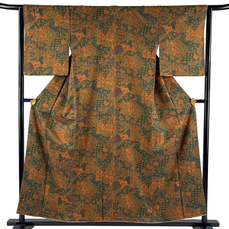 【着物ランク】優品 【素材】正絹 【身丈】約155cm 【裄丈】約64cm 【袖丈】約50cm 【袖幅】約32cm 【前幅】約23cm 【後幅】約30.5cm 【サイズ】M 【着物仕立て】袷 【着用時期】10~5月 【状態ランク】ランクA 【着物着用シーン】気軽なパーティー、観劇、食事会、正月、気軽なお茶会、街着