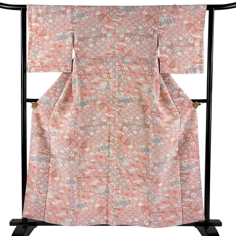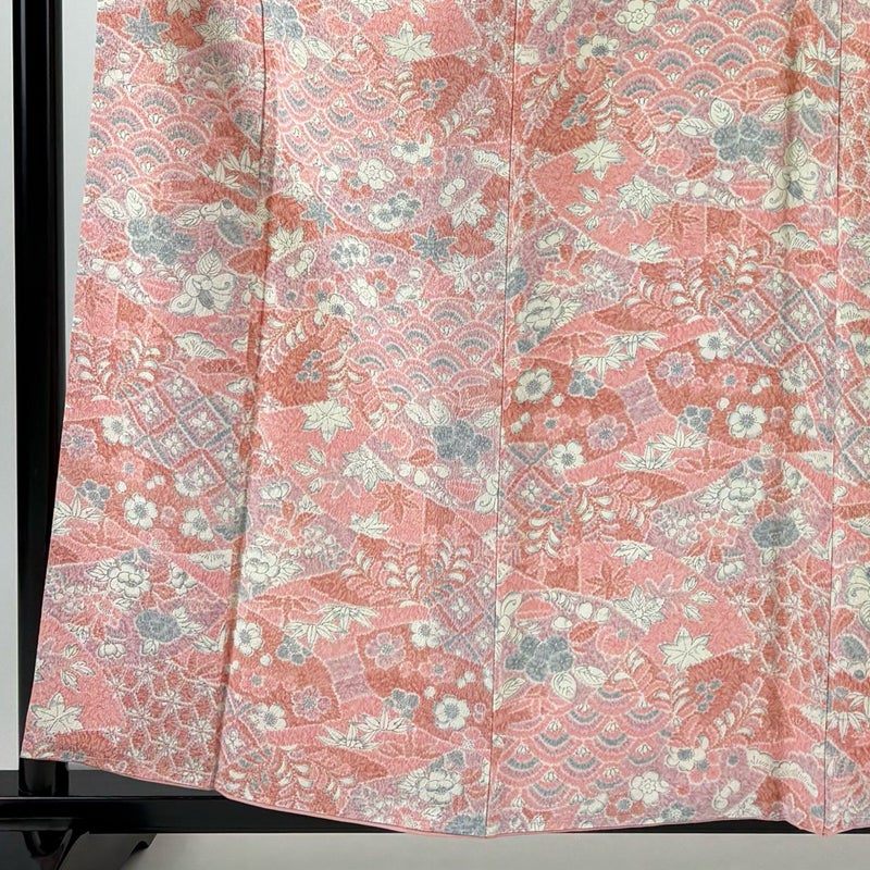 【小紋】 赤系 サーモンピンク 優品 A 約150cm~約159cm 裄丈62cm以下 (S)size 袖丈48cm 4000-7980 美品 二万以下