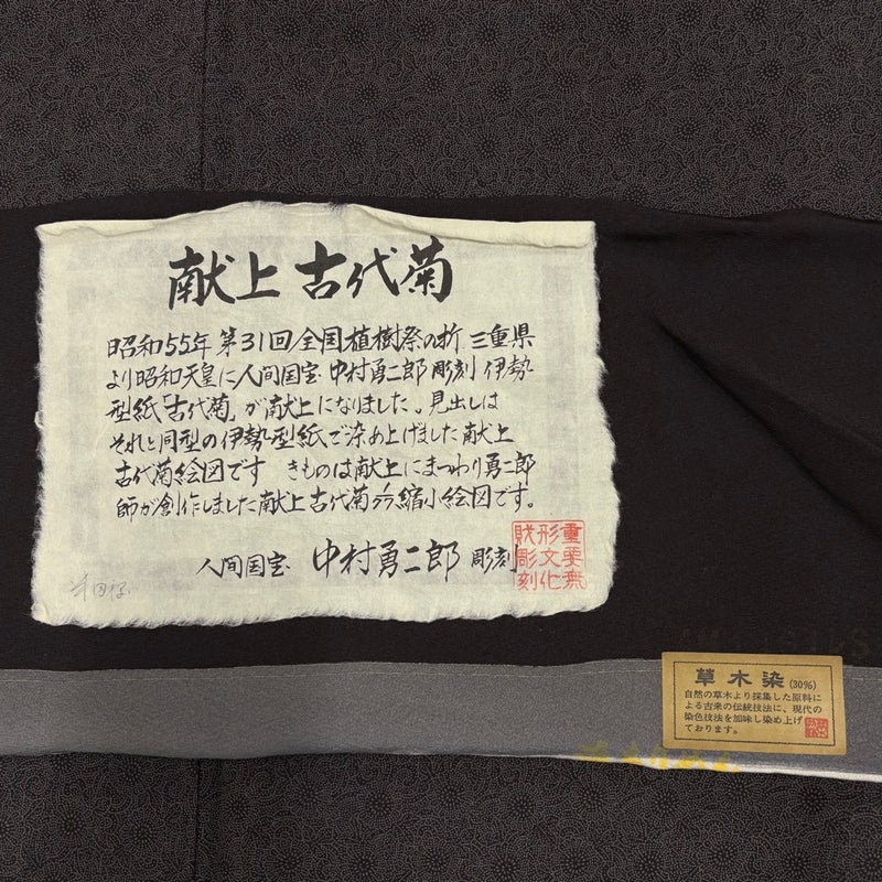 伊勢型紙道具彫の人間国宝「中村勇二郎」の作品でございます。 数百種類とある型紙から表現される職人の柄。 そのこだわり抜かれたデザインが光る素敵な江戸小紋でございます。 熟練の技で染め出されたお着物を是非、お楽しみ下さいませ。身丈を+4.0cm程、現在の長さから伸ばせます。 裄丈を+6.0cm程、現在の長さから伸ばせます。 一つ紋の縫い紋です。 表地所々にヤケがございます。 八掛にヤケがございます。 リユース品としては良い状態で、まだまだご活用頂けると思われます。 ※なお、厳しく商品の状態確認を行っておりますが、記載の汚れ以外にも見落とし箇所がある可能性がある旨ご了承いただけますと幸いです。 沢山の商品の中からご覧いただき誠にありがとうございます。