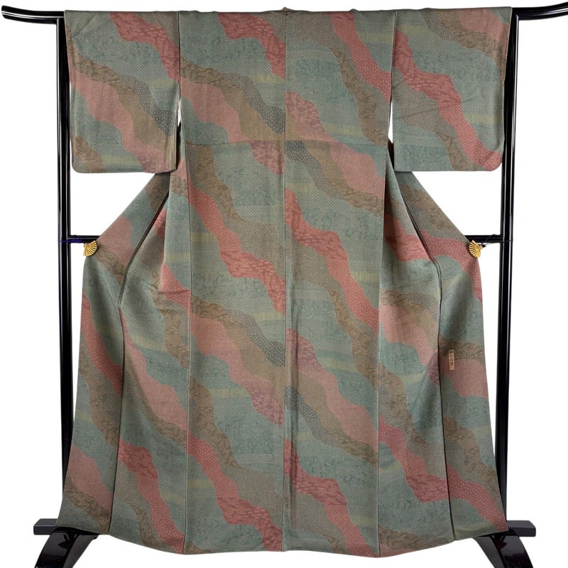 【着物ランク】優品 【素材】正絹 【身丈】約162cm 【裄丈】約64.5cm 【袖丈】約49cm 【袖幅】約33cm 【前幅】約23.5cm 【後幅】約30cm 【サイズ】M 【着物仕立て】袷 【着用時期】10~5月 【状態ランク】ランクB 【着物着用シーン】気軽なパーティー、観劇、食事会、正月、気軽なお茶会、街着