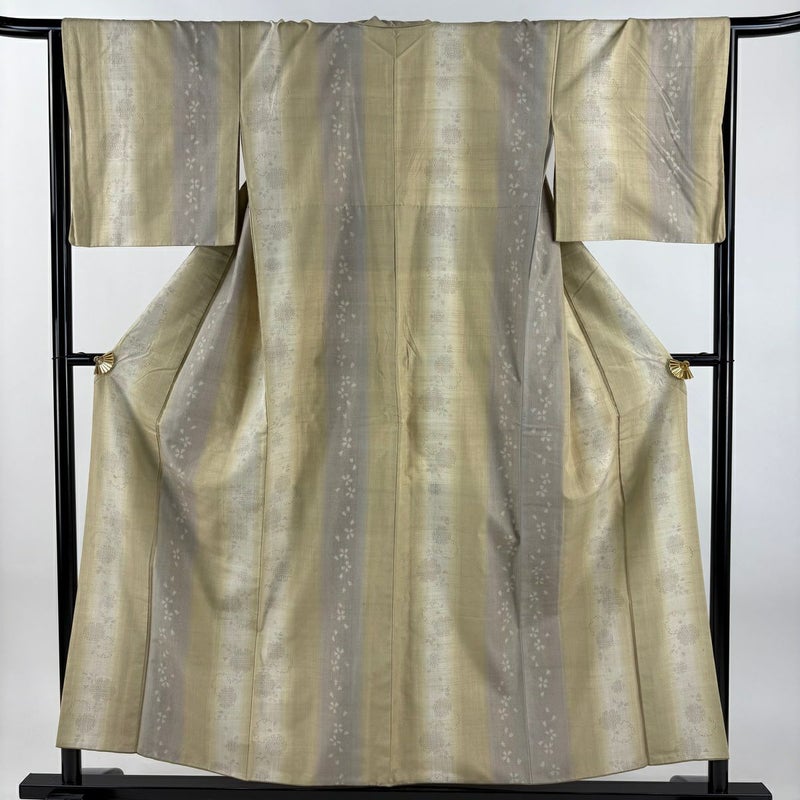 【着物ランク】秀品 【素材】正絹 【身丈】約155cm 【裄丈】約65cm 【袖丈】約45cm 【袖幅】約34cm 【前幅】約24.5cm 【後幅】約29.5cm 【サイズ】M 【着物仕立て】袷 【着用時期】10~5月 【状態ランク】ランクB 【着物着用シーン】気軽なパーティー、観劇、食事会、正月、気軽なお茶会、街着
