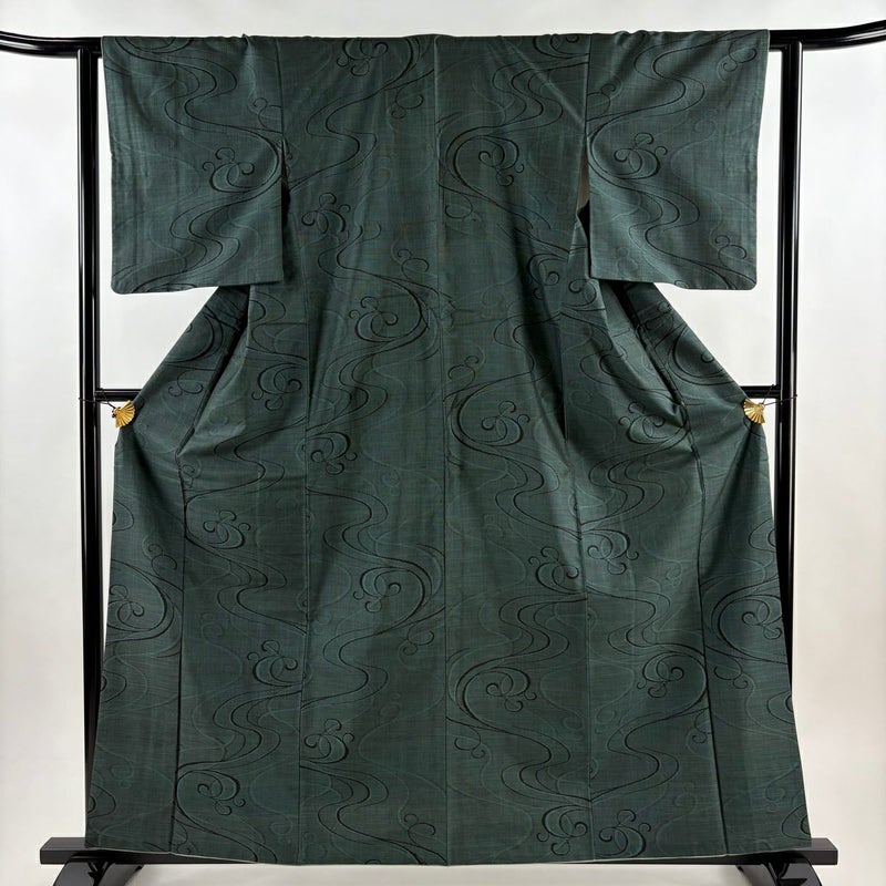 【紬】 緑系 深緑 秀品 B 約160cm~約169cm 裄丈62cm以下 (S)size 袖丈49cm 4000-7980 二万以下