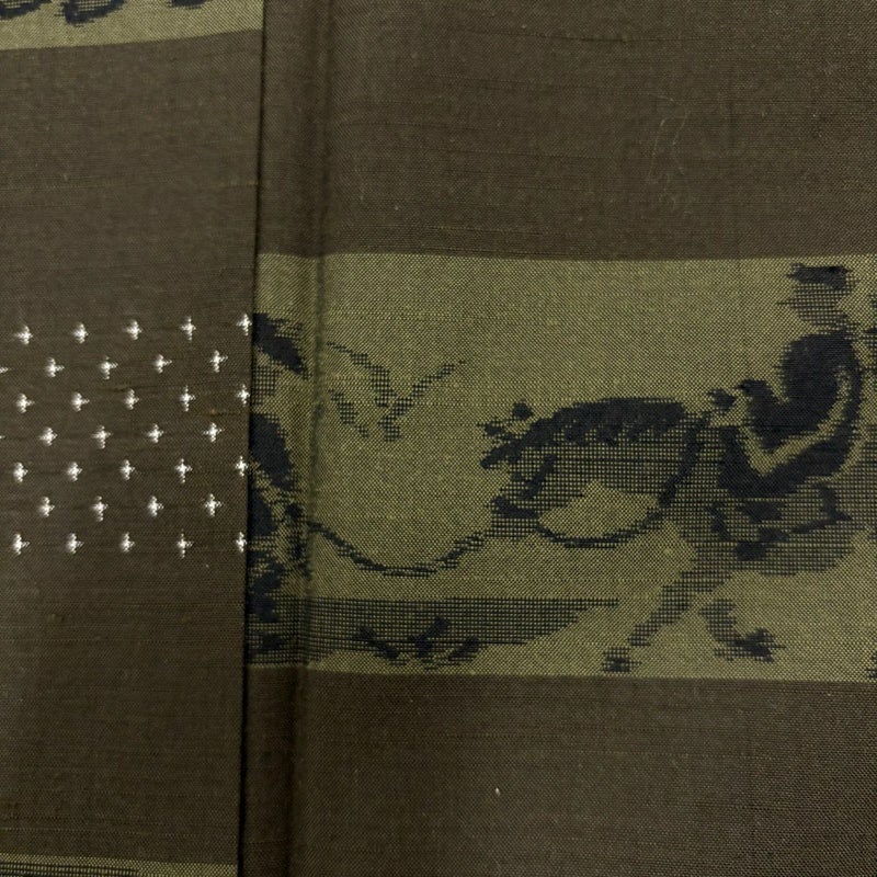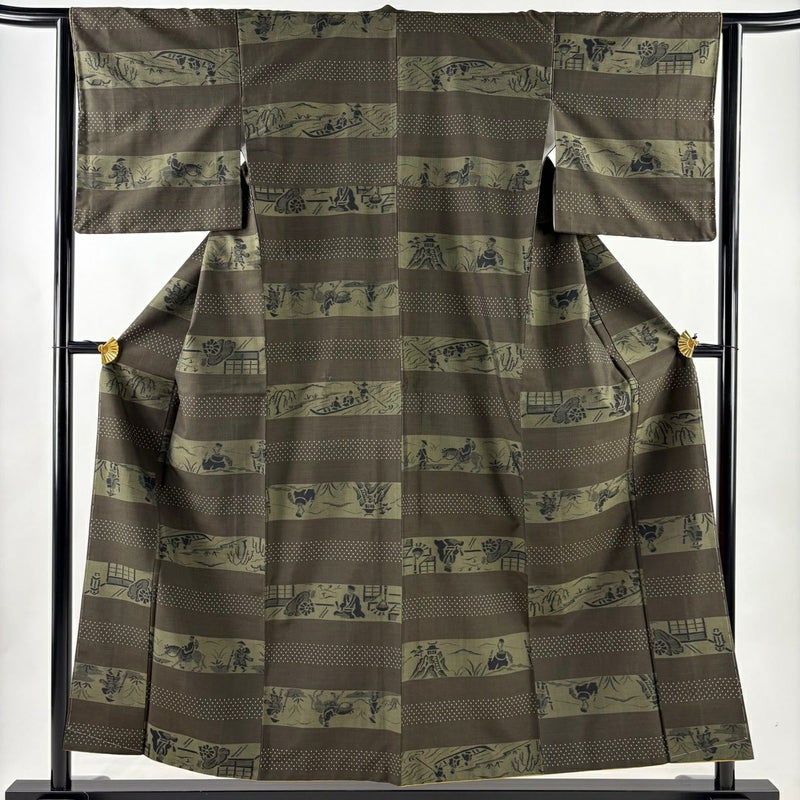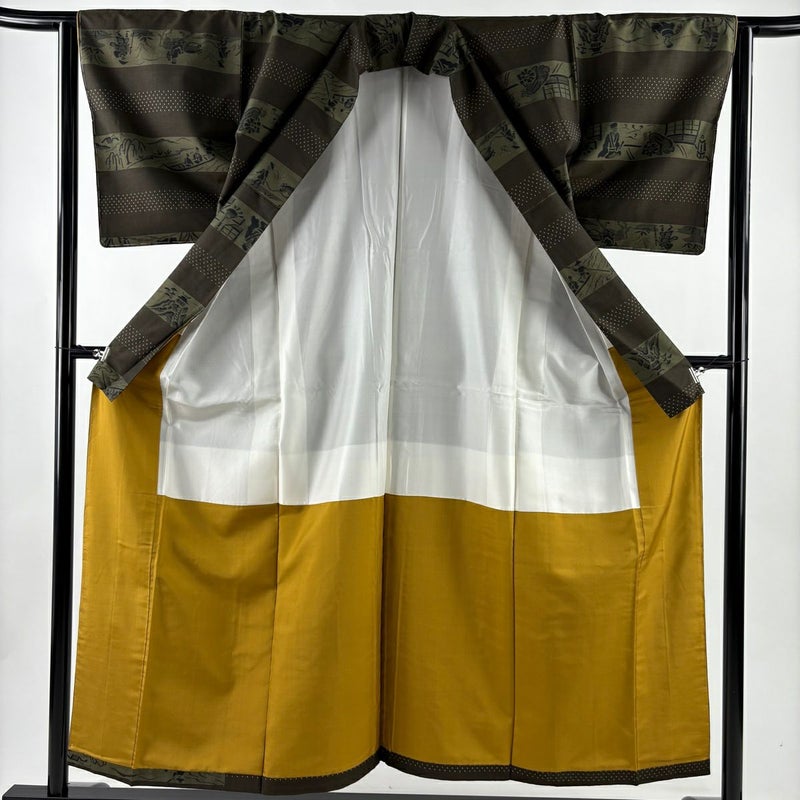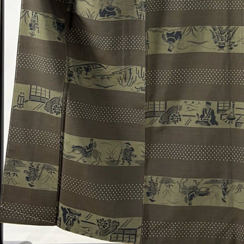 【紬】 茶系 茶緑色 秀品 A 約150cm~約159cm 裄丈63cm-64cm (S)size 袖丈47cm 7990-9980 美品 二万以下