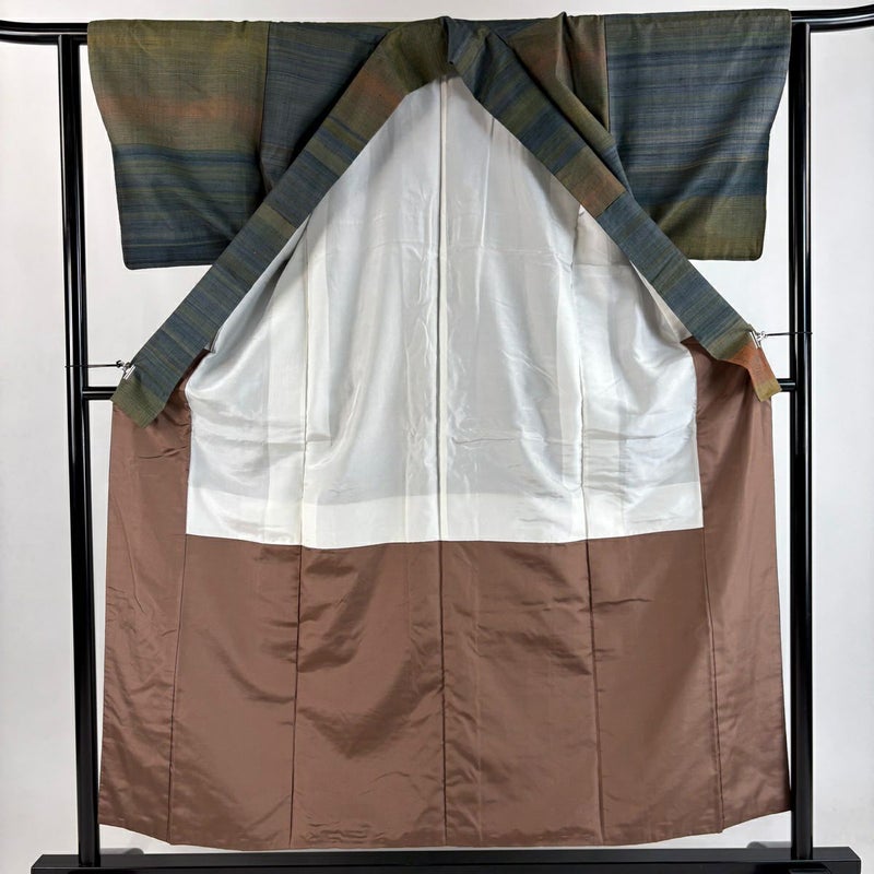 普段着やおしゃれ着として人気の紬でございます。 元々は日常着として着用していたので、その土地の風土に合った様々な種類がある素敵な一品です。 ※身丈・裄丈の縫込みの長さは測っておりません。 表地所々にシワがございます。 胴裏にホックシミ、裏地両脇に薄い汗シミがございます。 リユース品としては良い状態で、まだまだご活用頂けると思われます。 ※なお、厳しく商品の状態確認を行っておりますが、記載の汚れ以外にも見落とし箇所がある可能性がある旨ご了承いただけますと幸いです。 沢山の商品の中からご覧いただき誠にありがとうございます。