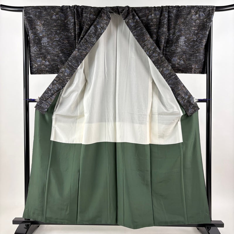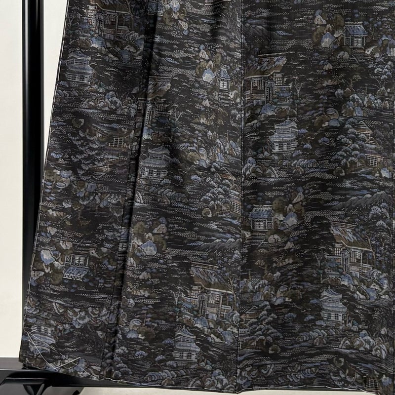 【紬】 黒系 黒 名品 A 約160cm~約169cm 裄丈69cm以上 (L)size 袖丈49cm 9990-29990 美品 二万以下