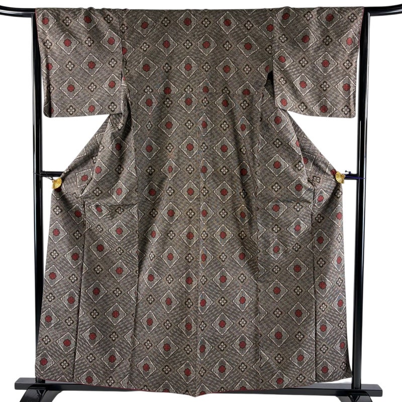 【着物ランク】秀品 【素材】正絹 【身丈】約158.5cm 【裄丈】約64.5cm 【袖丈】約45cm 【袖幅】約34.5cm 【前幅】約24cm 【後幅】約28.5cm 【サイズ】M 【着物仕立て】袷 【着用時期】10~5月 【状態ランク】ランクB 【着物着用シーン】気軽なパーティー、観劇、食事会、正月、気軽なお茶会、街着