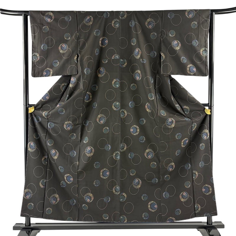 【着物ランク】秀品 【素材】正絹 【身丈】約156cm 【裄丈】約63.5cm 【袖丈】約49.5cm 【袖幅】約32.5cm 【前幅】約24.5cm 【後幅】約30cm 【サイズ】S 【着物仕立て】袷 【着用時期】10~5月 【状態ランク】ランクB 【着物着用シーン】気軽なパーティー、観劇、食事会、正月、気軽なお茶会、街着