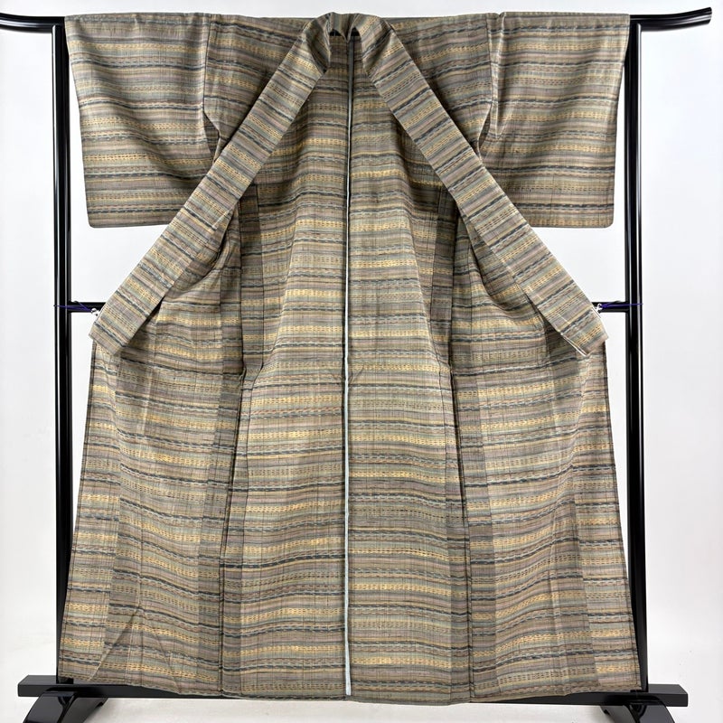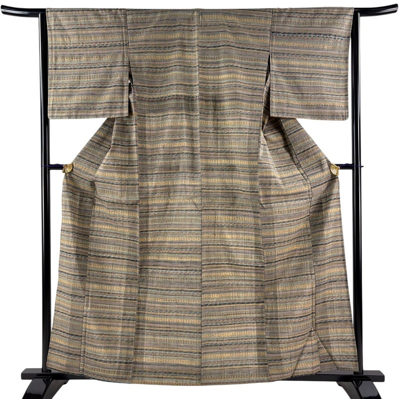 【着物ランク】秀品 【素材】正絹 【身丈】約159.5cm 【裄丈】約63cm 【袖丈】約49.5cm 【袖幅】約33.5cm 【前幅】約23cm 【後幅】約28.5cm 【サイズ】S 【着物仕立て】単衣 【着用時期】6/9月 【状態ランク】ランクB 【着物着用シーン】気軽なパーティー、観劇、食事会、正月、気軽なお茶会、街着