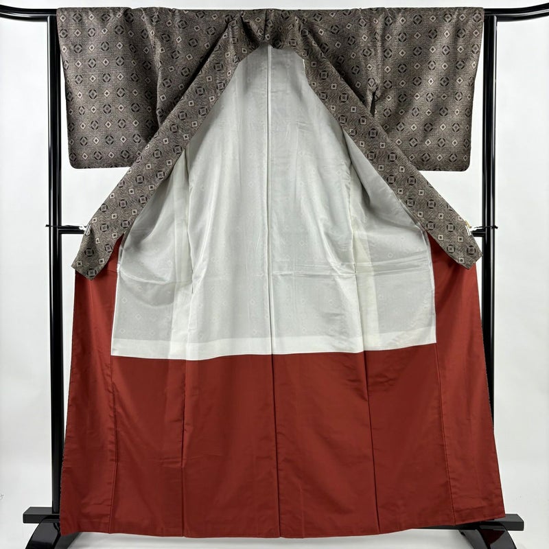 【着物ランク】秀品 【素材】正絹 【身丈】約163.5cm 【裄丈】約63.5cm 【袖丈】約49cm 【袖幅】約32.5cm 【前幅】約23cm 【後幅】約30.5cm 【サイズ】S 【着物仕立て】袷 【着用時期】10~5月 【状態ランク】ランクC 【着物着用シーン】気軽なパーティー、観劇、食事会、正月、気軽なお茶会、街着