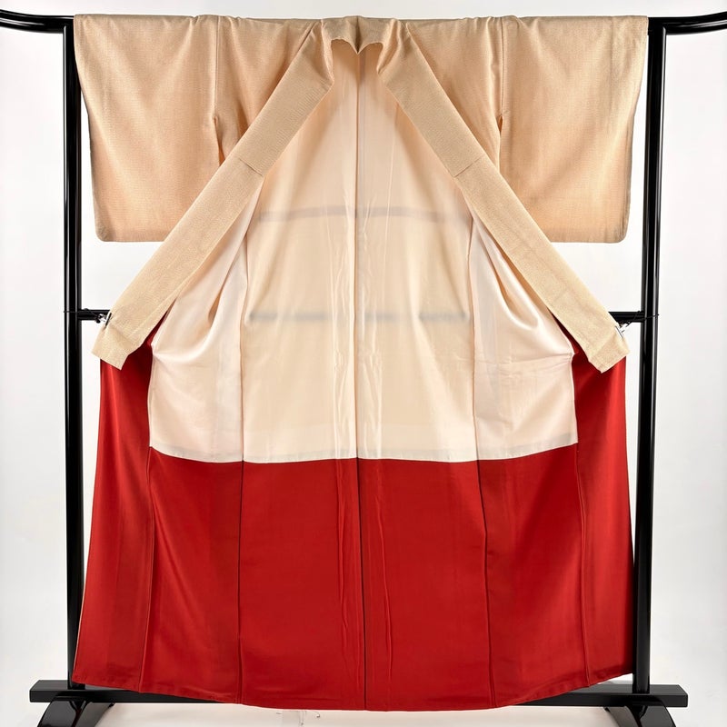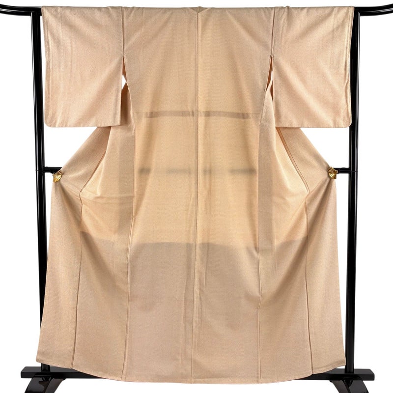 【着物ランク】秀品 【素材】正絹 【身丈】約161cm 【裄丈】約64cm 【袖丈】約50cm 【袖幅】約33cm 【前幅】約23cm 【後幅】約29.5cm 【サイズ】M 【着物仕立て】袷 【着用時期】10~5月 【状態ランク】ランクA 【着物着用シーン】気軽なパーティー、観劇、食事会、正月、気軽なお茶会、街着