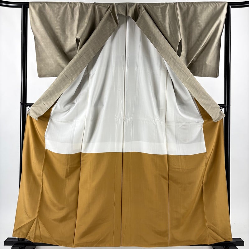 【着物ランク】秀品 【素材】正絹 【身丈】約161cm 【裄丈】約63cm 【袖丈】約49cm 【袖幅】約32cm 【前幅】約25cm 【後幅】約30.5cm 【サイズ】S 【着物仕立て】袷 【着用時期】10~5月 【状態ランク】ランクA 【着物着用シーン】気軽なパーティー、観劇、食事会、正月、気軽なお茶会、街着