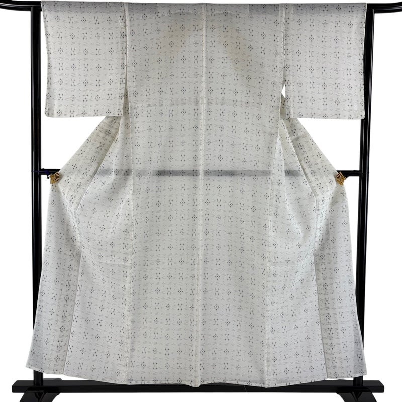 【着物ランク】秀品 【素材】正絹 【身丈】約155.5cm 【裄丈】約63.5cm 【袖丈】約46.5cm 【袖幅】約31.5cm 【前幅】約25cm 【後幅】約31cm 【サイズ】S 【着物仕立て】薄物 【着用時期】7~8月 【状態ランク】ランクA 【着物着用シーン】気軽なパーティー、観劇、食事会、正月、気軽なお茶会、街着