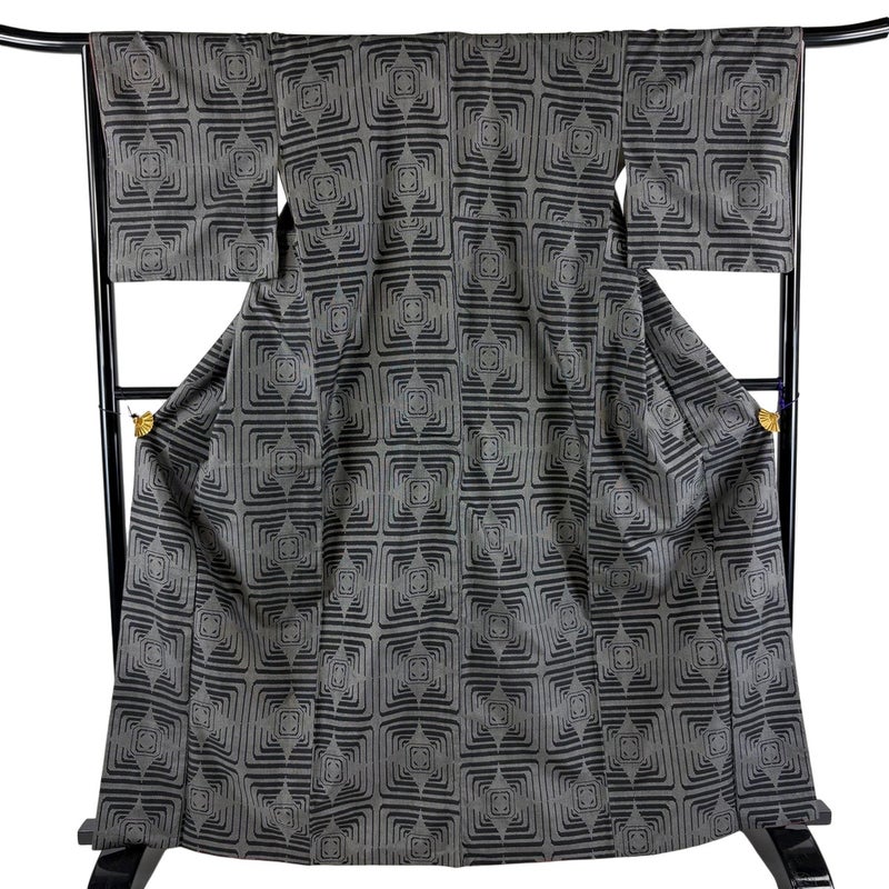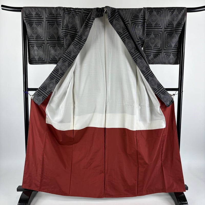 【着物ランク】秀品 【素材】正絹 【身丈】約164cm 【裄丈】約66cm 【袖丈】約47cm 【袖幅】約33cm 【前幅】約26.5cm 【後幅】約30cm 【サイズ】M 【着物仕立て】袷 【着用時期】10~5月 【状態ランク】ランクC 【着物着用シーン】気軽なパーティー、観劇、食事会、正月、気軽なお茶会、街着