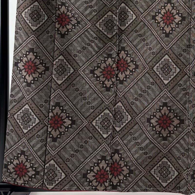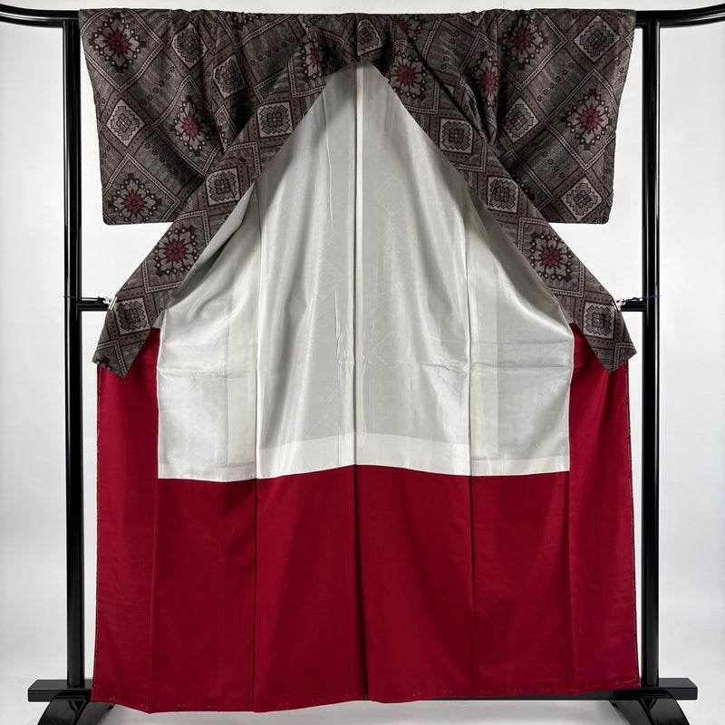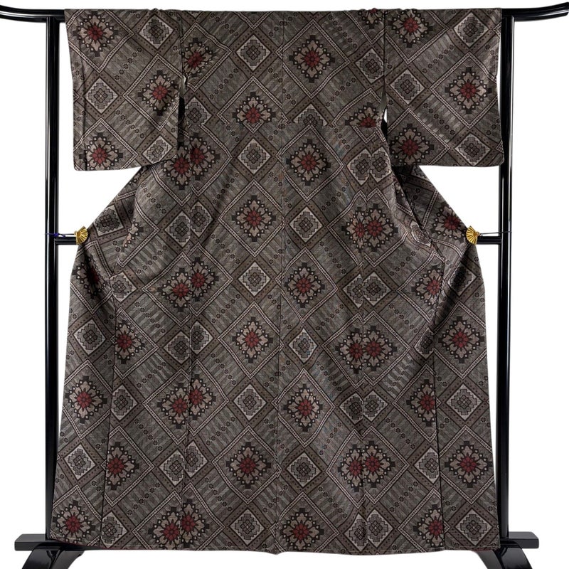 【着物ランク】秀品 【素材】正絹 【身丈】約161cm 【裄丈】約63cm 【袖丈】約49cm 【袖幅】約33cm 【前幅】約23cm 【後幅】約28.5cm 【サイズ】S 【着物仕立て】袷 【着用時期】10~5月 【状態ランク】ランクA 【着物着用シーン】気軽なパーティー、観劇、食事会、正月、気軽なお茶会、街着