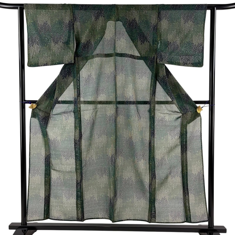 【着物ランク】秀品 【素材】正絹 【身丈】約155.5cm 【裄丈】約62cm 【袖丈】約45.5cm 【袖幅】約32.5cm 【前幅】約27cm 【後幅】約29.5cm 【サイズ】S 【着物仕立て】薄物 【着用時期】7~8月 【状態ランク】ランクB 【着物着用シーン】気軽なパーティー、観劇、食事会、正月、気軽なお茶会、街着