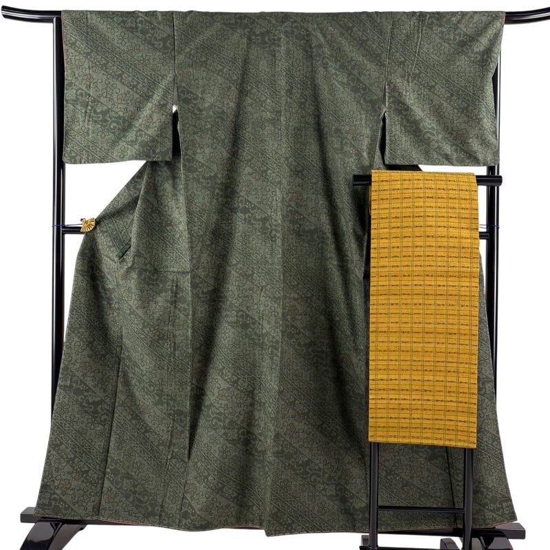普段着やおしゃれ着として人気の紬でございます。 元々は日常着として着用していたので、その土地の風土に合った様々な種類がある素敵な一品です。 ※身丈・裄丈の縫込みの長さは測っておりません。 ※帯は丁寧に細部まで状態確認しておりません。予めご了承くださいませ。 上前所々にシワがございます。 リユース品としては目立った染み傷なく、状態の良いお品でございます。 ※なお、厳しく商品の状態確認を行っておりますが、記載の汚れ以外にも見落とし箇所がある可能性がある旨ご了承いただけますと幸いです。 沢山の商品の中からご覧いただき誠にありがとうございます。