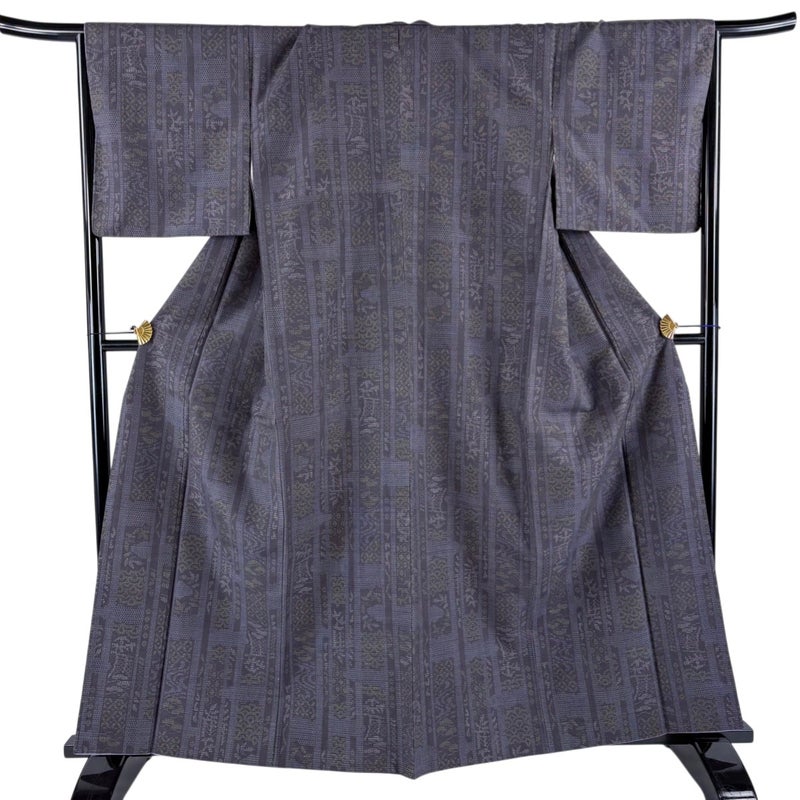 【着物ランク】秀品 【素材】正絹 【身丈】約161.5cm 【裄丈】約66.5cm 【袖丈】約45.5cm 【袖幅】約33cm 【前幅】約26cm 【後幅】約31.5cm 【サイズ】M 【着物仕立て】袷 【着用時期】10~5月 【状態ランク】ランクA 【着物着用シーン】気軽なパーティー、観劇、食事会、正月、気軽なお茶会、街着