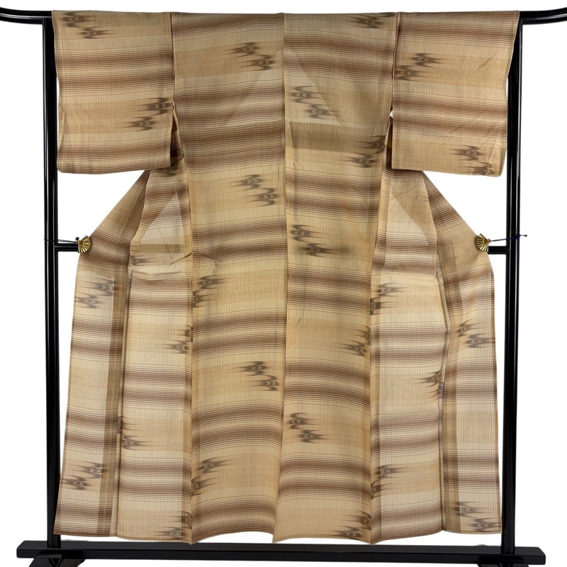 【着物ランク】名品 【素材】正絹 【身丈】約154cm 【裄丈】約65cm 【袖丈】約48cm 【袖幅】約33cm 【前幅】約25cm 【後幅】約31cm 【サイズ】M 【着物仕立て】薄物 【着用時期】7~8月 【状態ランク】ランクA 【着物着用シーン】気軽なパーティー、観劇、食事会、正月、気軽なお茶会、街着