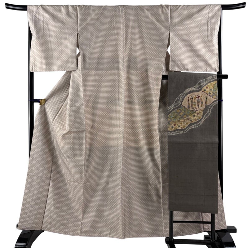 【着物ランク】秀品 【素材】正絹 【身丈】約164cm 【裄丈】約67cm 【袖丈】約48.5cm 【袖幅】約34cm 【前幅】約28cm 【後幅】約30.5cm 【サイズ】M 【着物仕立て】袷 【着用時期】10~5月 【帯丈2】約382cm 【帯幅2】約30.5cm 【状態ランク】ランクA 【着物着用シーン】気軽なパーティー、観劇、食事会、正月、気軽なお茶会、街着