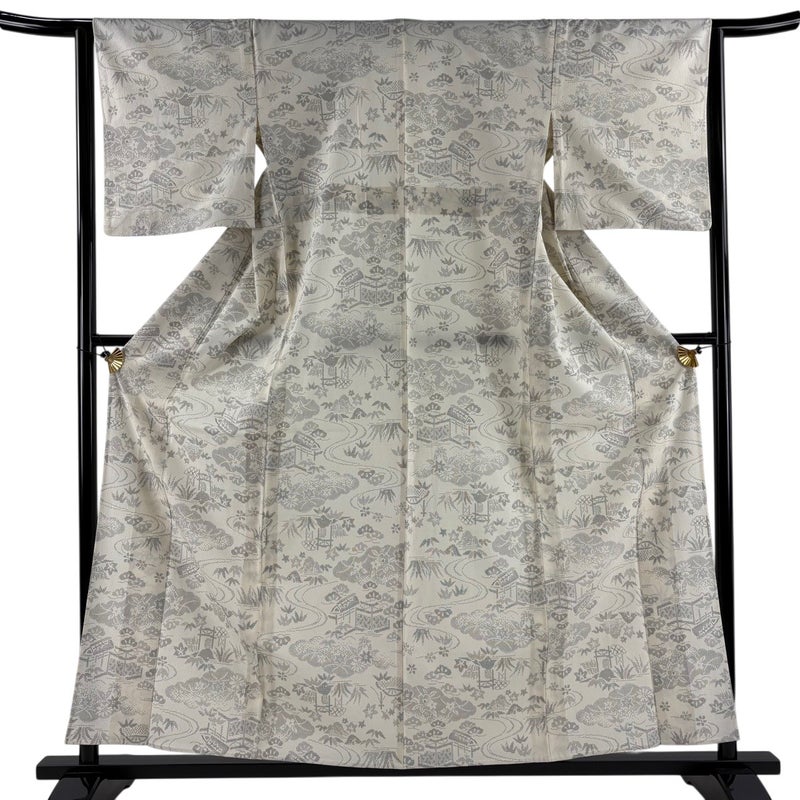 【着物ランク】秀品 【素材】正絹 【身丈】約159cm 【裄丈】約63.5cm 【袖丈】約47.5cm 【袖幅】約32cm 【前幅】約23.5cm 【後幅】約30.5cm 【サイズ】S 【着物仕立て】単衣 【着用時期】6/9月 【状態ランク】ランクC 【着物着用シーン】気軽なパーティー、観劇、食事会、正月、気軽なお茶会、街着