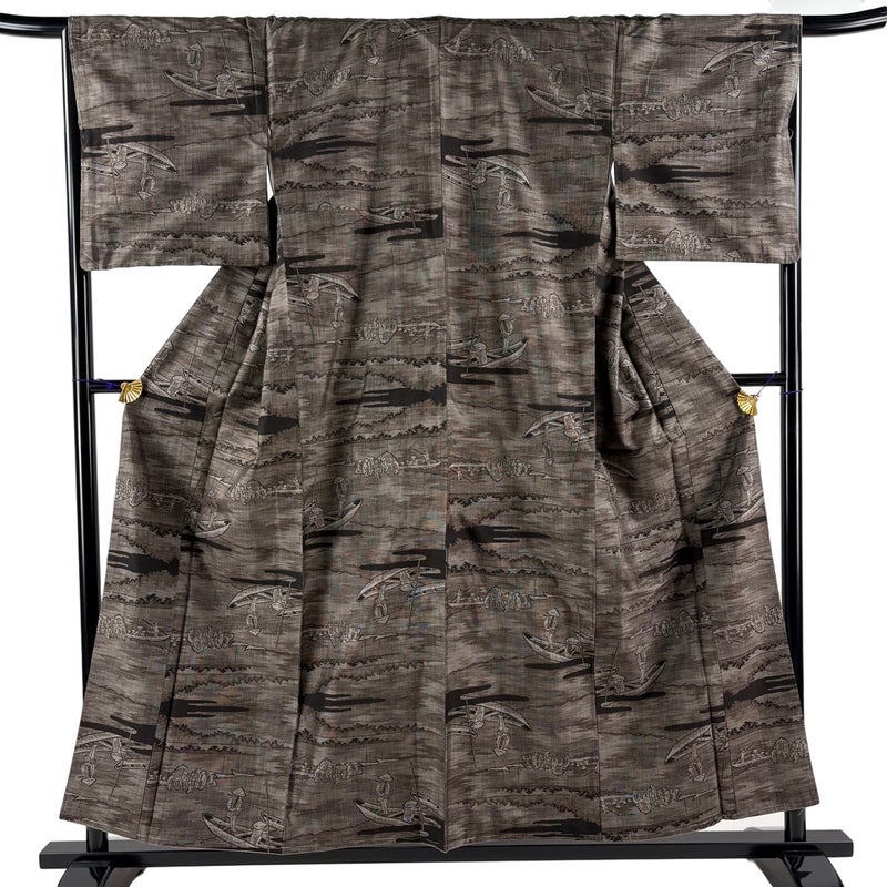 【着物ランク】秀品 【素材】正絹 【身丈】約155.5cm 【裄丈】約66.5cm 【袖丈】約46cm 【袖幅】約34.5cm 【前幅】約27cm 【後幅】約31.5cm 【サイズ】M 【着物仕立て】袷 【着用時期】10~5月 【状態ランク】ランクB 【着物着用シーン】気軽なパーティー、観劇、食事会、正月、気軽なお茶会、街着