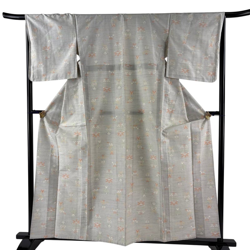 【着物ランク】優品 【素材】正絹 【身丈】約159.5cm 【裄丈】約66cm 【袖丈】約48cm 【袖幅】約34cm 【前幅】約22.5cm 【後幅】約28cm 【サイズ】M 【着物仕立て】単衣 【着用時期】6/9月 【状態ランク】ランクB 【着物着用シーン】気軽なパーティー、観劇、食事会、正月、気軽なお茶会、街着