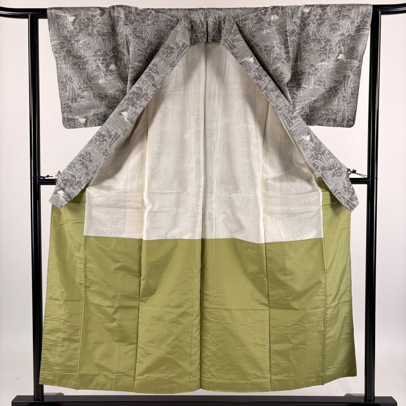 【紬】 灰色系 灰緑 優品 B 約150cm~約159cm 裄丈62cm以下 (S)size 袖丈47cm -3980 二万以下
