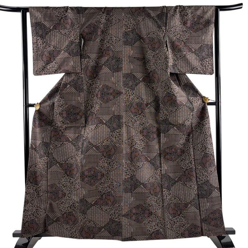 【着物ランク】名品 【素材】正絹 【身丈】約163cm 【裄丈】約64cm 【袖丈】約48cm 【袖幅】約32cm 【前幅】約24.5cm 【後幅】約29.5cm 【サイズ】M 【着物仕立て】袷 【着用時期】10~5月 【状態ランク】ランクA 【着物着用シーン】気軽なパーティー、観劇、食事会、正月、気軽なお茶会、街着