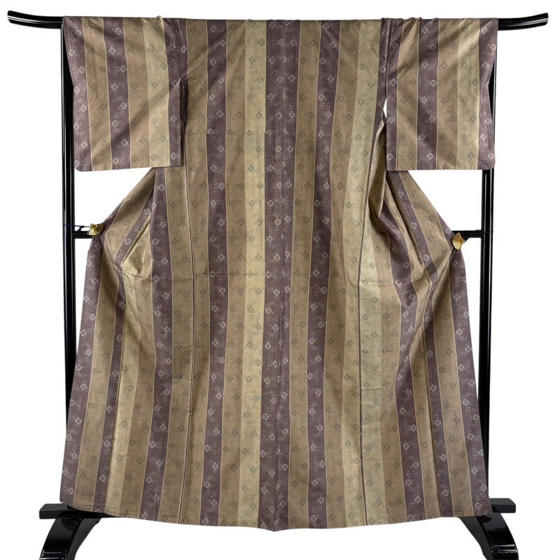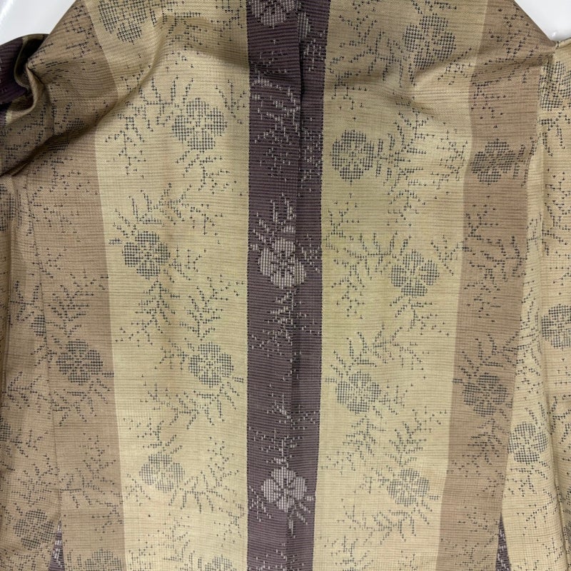 【着物ランク】名品 【素材】正絹 【身丈】約163cm 【裄丈】約67cm 【袖丈】約49cm 【袖幅】約34cm 【前幅】約24.5cm 【後幅】約30cm 【サイズ】M 【着物仕立て】袷 【着用時期】10~5月 【状態ランク】ランクC 【着物着用シーン】気軽なパーティー、観劇、食事会、正月、気軽なお茶会、街着
