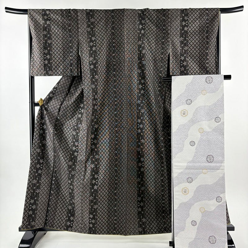 【着物ランク】名品 【素材】正絹 【身丈】約162cm 【裄丈】約66.5cm 【袖丈】約48.5cm 【袖幅】約34cm 【前幅】約26.5cm 【後幅】約32cm 【サイズ】M 【着物仕立て】袷 【着用時期】10~5月 【帯丈2】約444cm 【帯幅2】約31cm 【状態ランク】ランクA 【着物着用シーン】気軽なパーティー、観劇、食事会、正月、気軽なお茶会、街着