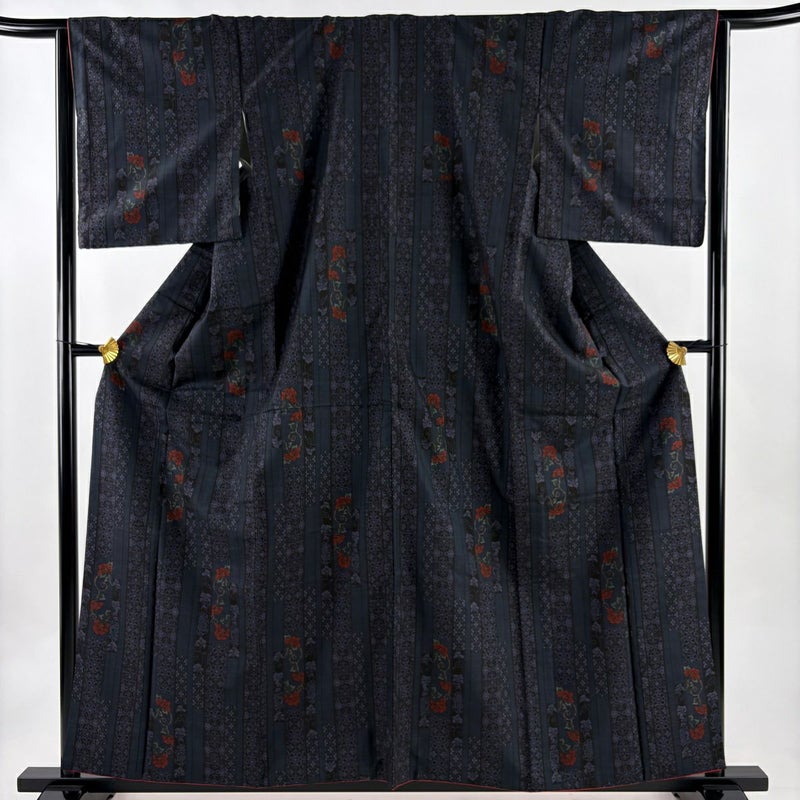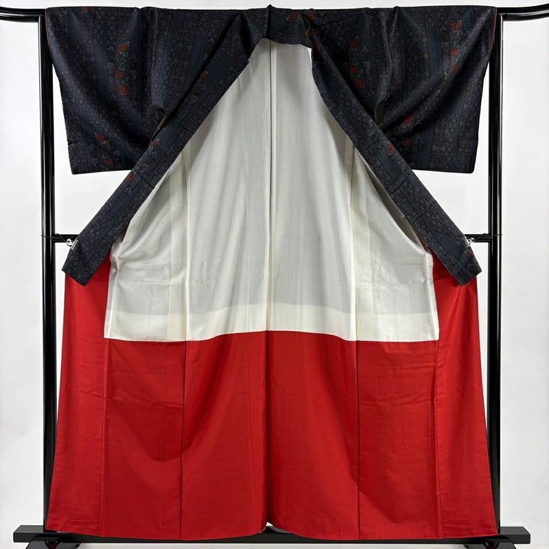 【着物ランク】秀品 【素材】正絹 【身丈】約160.5cm 【裄丈】約65cm 【袖丈】約49cm 【袖幅】約33.5cm 【前幅】約24.5cm 【後幅】約30.5cm 【サイズ】M 【着物仕立て】袷 【着用時期】10~5月 【状態ランク】ランクA 【着物着用シーン】気軽なパーティー、観劇、食事会、正月、気軽なお茶会、街着