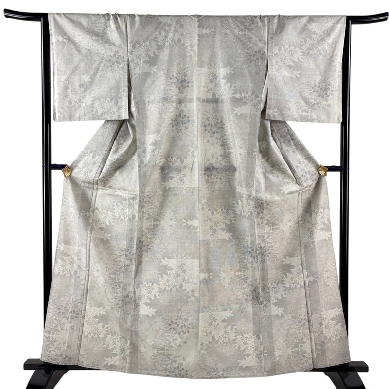 【着物ランク】秀品 【素材】正絹 【身丈】約162cm 【裄丈】約65cm 【袖丈】約48cm 【袖幅】約33.5cm 【前幅】約24cm 【後幅】約30cm 【サイズ】M 【着物仕立て】単衣 【着用時期】6/9月 【状態ランク】ランクB 【着物着用シーン】気軽なパーティー、観劇、食事会、正月、気軽なお茶会、街着