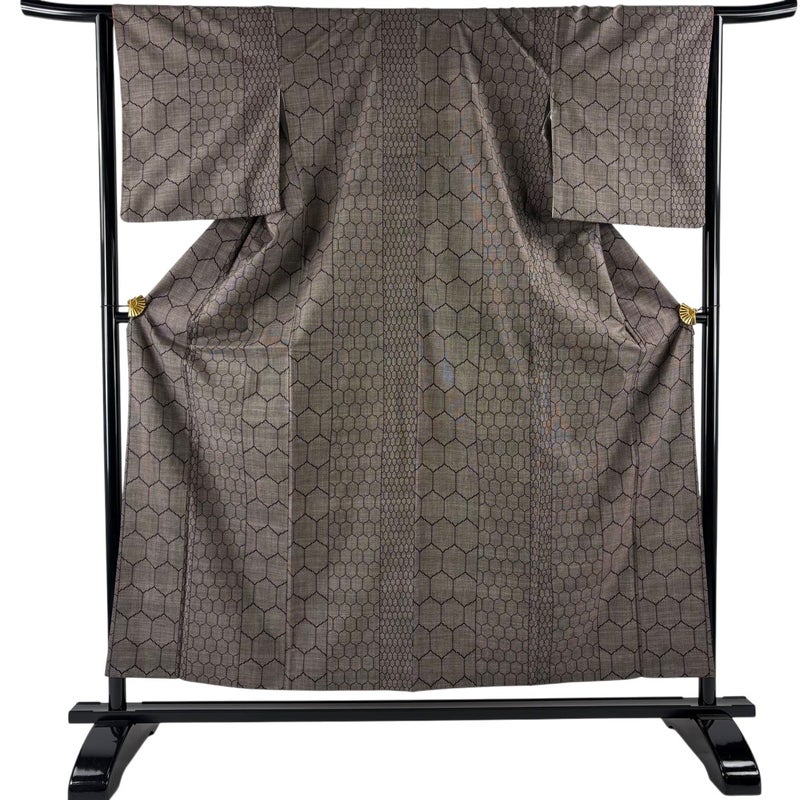 極上の着心地を誘い、洒落度溢れる絹音がお洒落心を満たす大島紬でございます。 紬特有の絹なりが感じられる一品となっております。 ※身丈・裄丈の縫込みの長さは測っておりません。 衿周りや両袖口中に汚れがございます。 八掛にシワ、裏地両脇に薄い汗シミがございます。 リユース品としては目立った染み傷なく、状態の良いお品でございます。 ※なお、厳しく商品の状態確認を行っておりますが、記載の汚れ以外にも見落とし箇所がある可能性がある旨ご了承いただけますと幸いです。 沢山の商品の中からご覧いただき誠にありがとうございます。