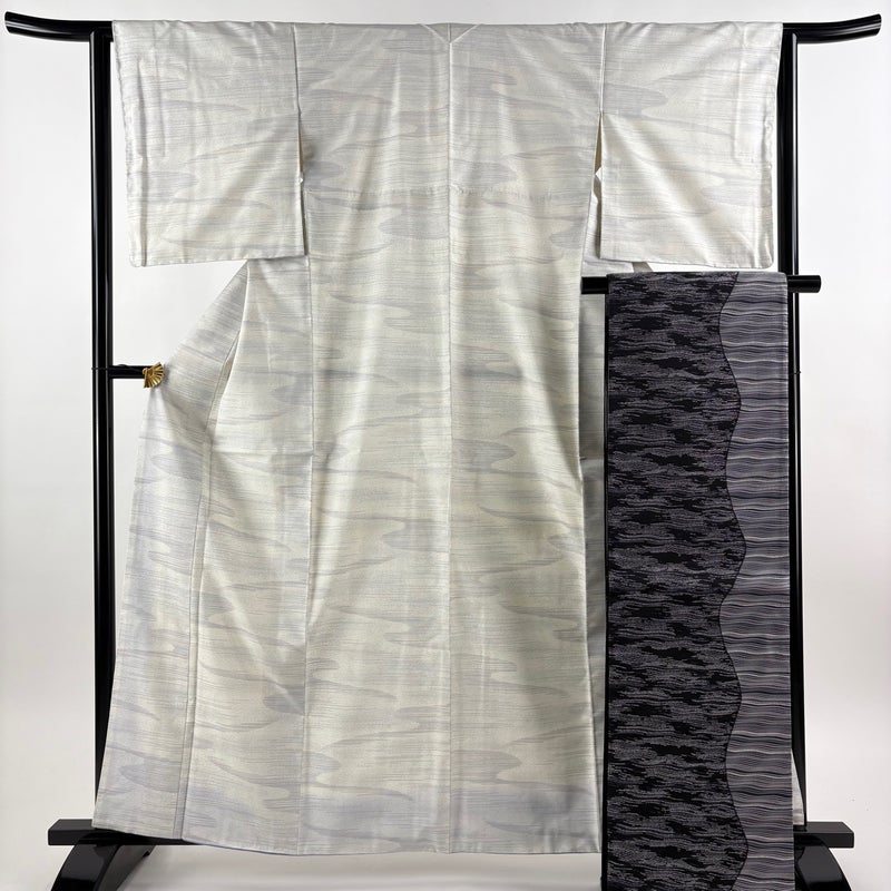 【着物ランク】秀品 【素材】正絹 【身丈】約162cm 【裄丈】約63cm 【袖丈】約49.5cm 【袖幅】約33.5cm 【前幅】約24cm 【後幅】約28.5cm 【サイズ】S 【着物仕立て】袷 【着用時期】10~5月 【帯丈2】約444cm 【帯幅2】約31cm 【状態ランク】ランクA 【着物着用シーン】気軽なパーティー、観劇、食事会、正月、気軽なお茶会、街着